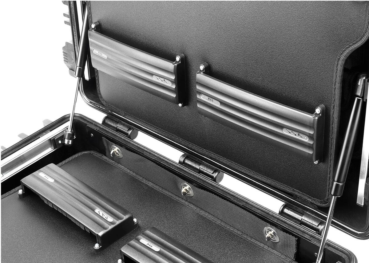 Vnitřní prostor s vyjímatelnými nástrojovými deskami pro přehledné uložení nářadí.
