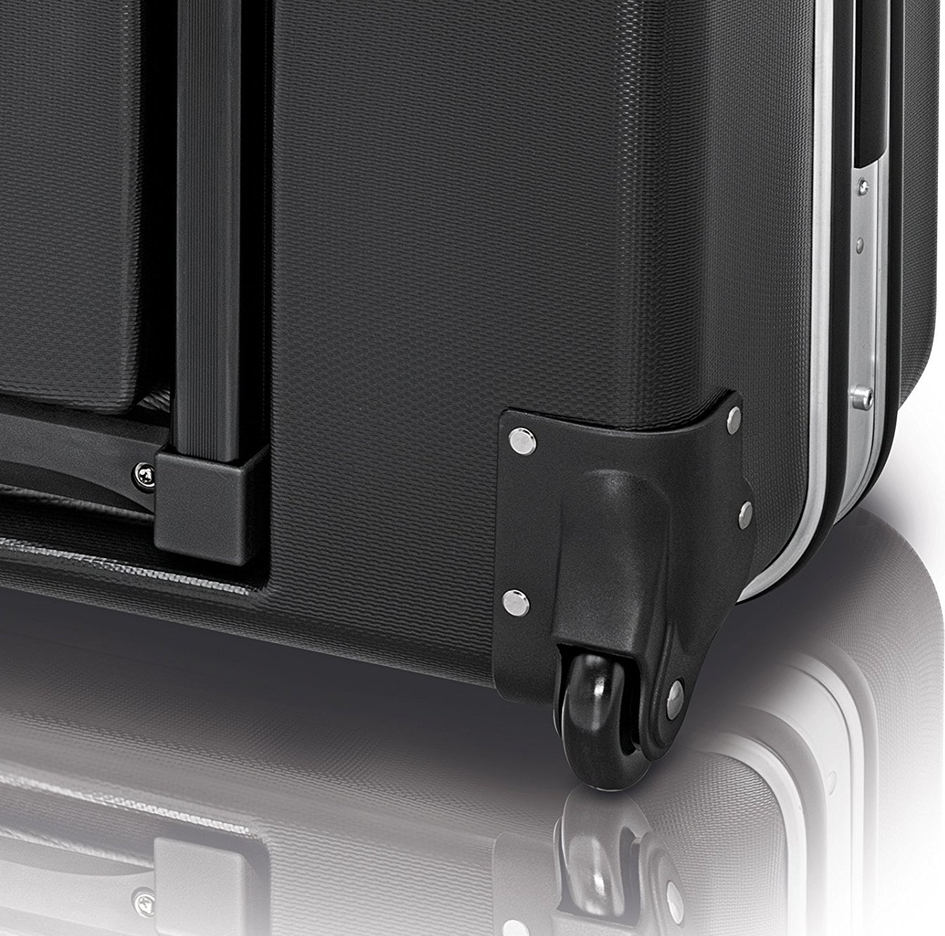 Odolné provedení z materiálu ABS, černé. Hliníkový rám po obvodu a pevně namontovaná, stabilní přepážka osaditelná z obou stran s mnoha možnostmi uložení nářadí díky pružným poutkům a 12 kapsičkám. Výsuvná rukojeť zapuštěná ve dně a dvě vnější skate kolečka s lehkým chodem. Zatížitelnost do 30 kg. Otevírání z jedné strany nebo oboustranné (tvar V). dno a víko lze nezávisle na sobě zcela nebo zčásti otevírat. stabilní ve všech polohách otevření. speciální sanice chrání dno a zajišťují stabilitu. Lze uzamknout. Vyjímatelná přihrádka na dokumenty a vyjímatelná deska na nářadí s 13 kapsami na nářadí. Podlážka na dno, výška 60 mm, flexibilní členění přepážkami. deska na nářadí jako krycí deska se 13 kapsami na nářadí. Rozměry, vnější (Š x V x H): 510 x 270 x 410 mm. Rozměry, víko, vnitřní (Š x V x H): 480 x 105 x 370 mm. Rozměry, dno, vnitřní (Š x V x H): 445 x 105 x 330 mm