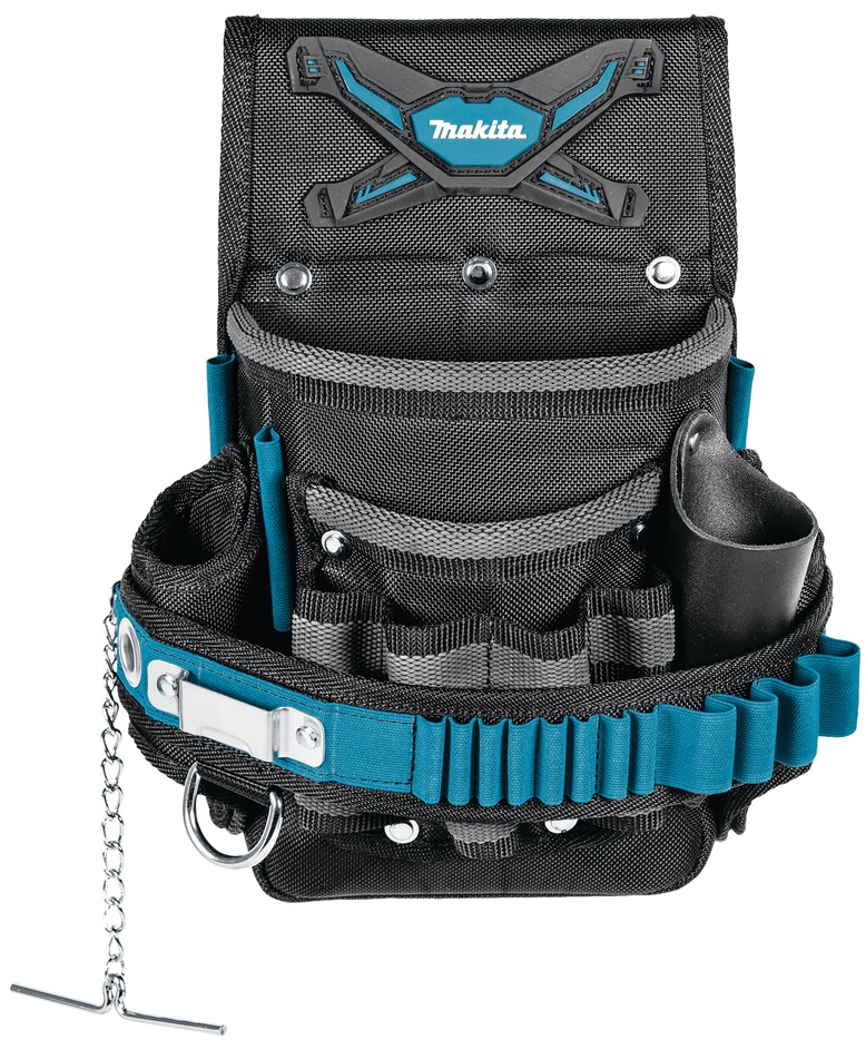 Četné elastické smyčky uvnitř pouzdra udržují nástroj bezpečně v přihrádce pomocí držáku řetězu pro izolační pásku a držáku metru