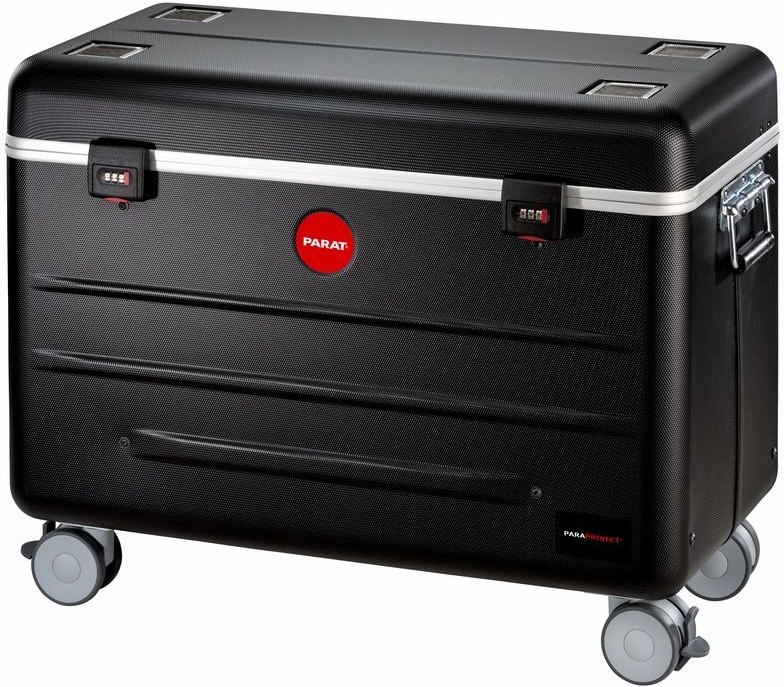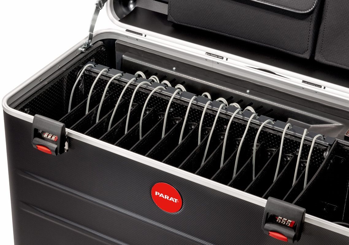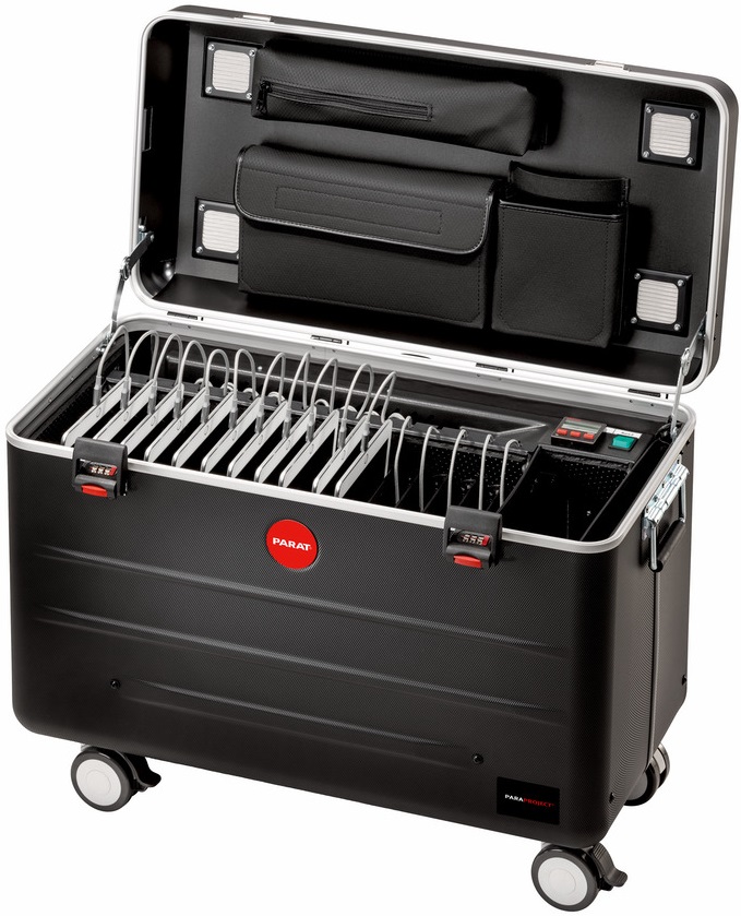 Jako řešení pro iPad ve třídách a školení se zavedl inteligentní kufřík PARAPROJECT® i16. Flexibilní systémový kufr nabízí v polstrované přihrádce prostor až pro 16 iPadu, které se přes centrální napájecí a synchronizační jednotku nabíjí a synchronizuje v optimální rychlosti. Díky USB konektorům umístěným v řadě umožňuje čisté vedení kabelů. Praktická technologie „Flex2Connect“ vám umožní vyměňovat nabíjecí/Sync kabely a typy konektorů nebo je kombinovat. Kromě toho lze k dispozici i konektory pro příslušenství jako Apple TV, Airport a MacBook až 15.6Ink. Úchyty na straně usnadňují přenášení a ochranu číselných zámků proti neoprávněnému přístupu. Jeho nízká hmotnost v kombinaci s 4 kolečky „EasyMove“ a teleskopickou rukojetí až 1 m činí z kufru velmi pohodlnou manipulaci. Odolný černý vnější obal z plastu X-ABS v hliníkovém rámu chrání před vnějšími vlivy. Pouzdro PARAProtect® Case i16 nabízí nejen dokonalou funkčnost, ale také atraktivní design a kvalitně zpracované materiály. Je kompatibilní se všemi iPad od generace 4, Air a Mini.