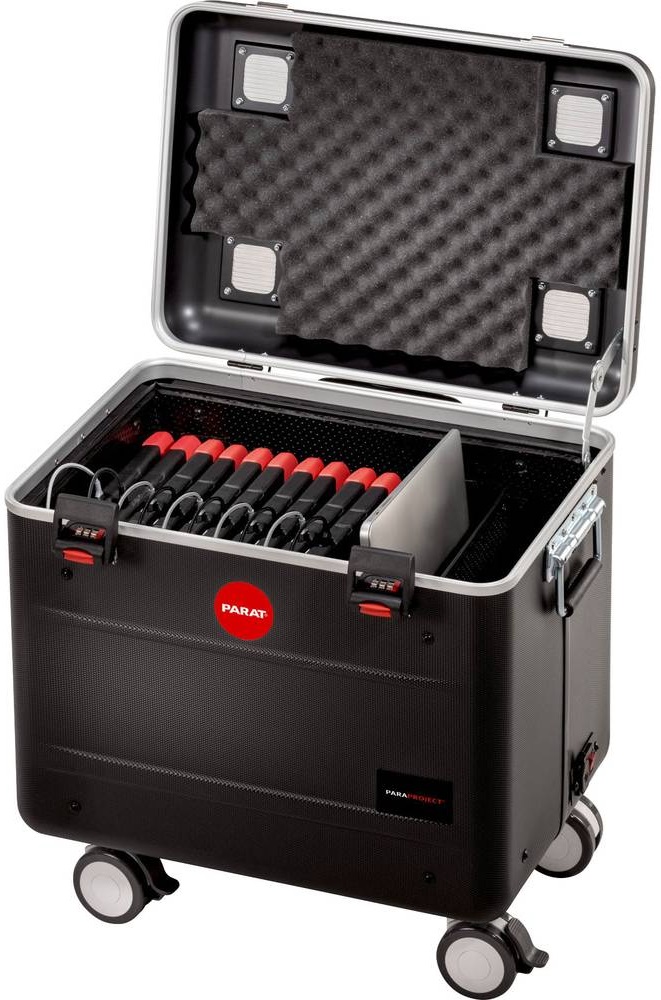 Kufr PARAPROJECT® TC10 EDUCOVER®+/KidsCover je ideální pro použití na základních nebo středních školách. Pohodlně se do něj vejde až 10 iPadů® v chytrých obalech EDUCOVER®+ nebo KidsCover. Pouzdro PARAPROJECT® Case TC10 EDUCOVER®+/KidsCover je obecně vhodné pro všechny tablety se silnějším ochranným krytem nebo krytem klávesnice. Inovativní moduly TwinCharge nabíjejí zařízení současně, bez ohledu na to, zda jsou připojena přes USB-A nebo USB-C. Kromě toho jsou iPady® nabíjeny podle standardů QuickCharge a napájeny pomocí USB-PD (Power Delivery). Nízká hmotnost je obzvláště praktická: PARAPROJECT® Case TC10 EDUCOVER®+/KidsCover váží pouze 9,5 kg. iPady jsou obzvláště dobře chráněny a snadno se přenášejí. Vně umístěný hlavní vypínač a integrovaná přepěťová ochrana poskytují nezbytnou bezpečnost pro každodenní použití. Kvalitní vozíkový systém s uzamykatelnými kolečky s hladkým chodem a výsuvnou teleskopickou rukojetí také zajišťuje pohodlnou přepravu kufru. Robustní černý vnější plášť z plastu X-ABS v hliníkovém rámu chrání před vnějšími vlivy. V závislosti na modelu lze objednat odpovídající EDUCOVER®+ s praktickými možnostmi uložení pro Apple Pencil® nebo logitech® Crayon nebo pouzdra KidsCover.