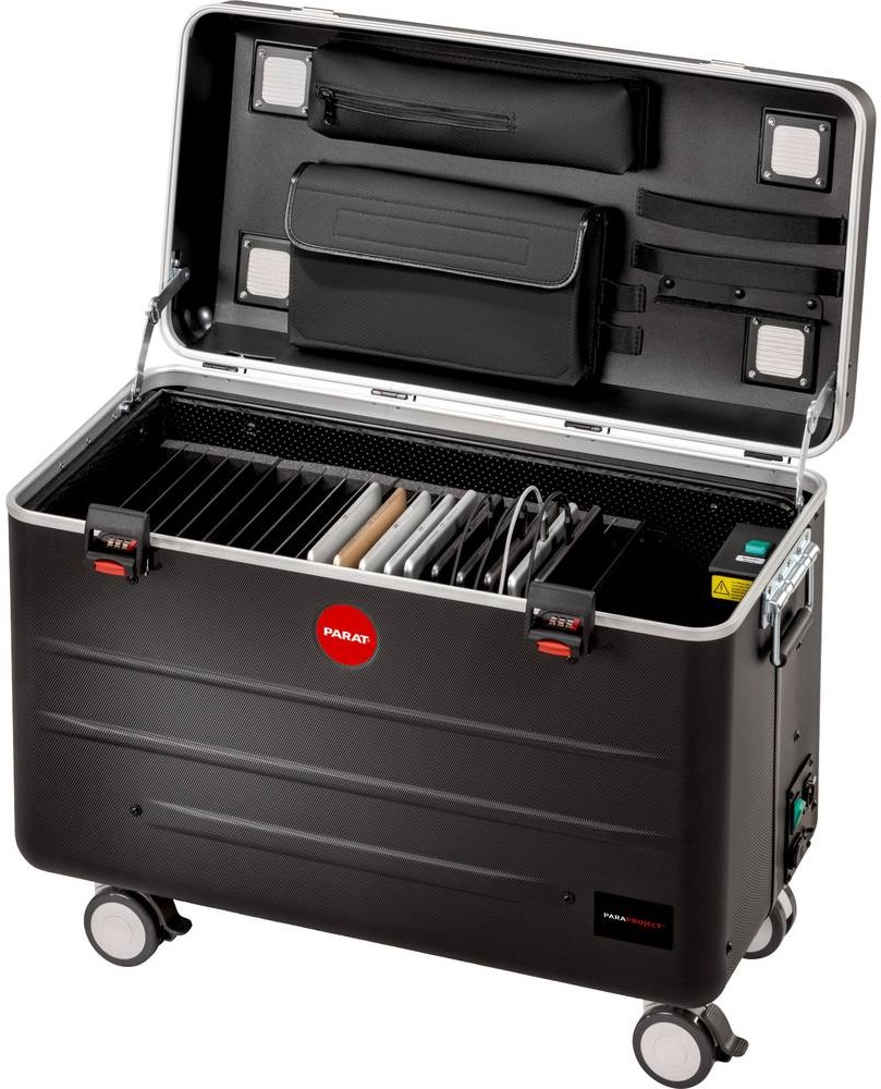 S mobilním úložným kufrem PARAPROJECT® Case TC20 Plus můžete nejen bezpečně uložit své tablety, ale také nabíjet své vybavení a přepravovat je z bodu A do bodu B. Mobilní úložná stanice nabízí prostor až pro 20 tabletů o maximální velikosti 11,5". Otevřené nebo zavřené pouzdro funguje pro všechny tablety iPad, Android a Windows, které lze nabíjet přes USB-A nebo USB-C. Umožňují to integrované moduly TwinCharge. Nabíjejí se také podle standardů QuickCharge a pružně reagují na USB-PD (Power Delivery), což je funkce vestavěné do elektrické zásuvky a inteligentního úložného bodu. Dvě kapsy připevněné k víku na příslušenství a drobné díly nabízejí další výhody. Hlavní vypínač integrovaný na vnější straně umožňuje snadné zapínání a vypínání celého pouzdra Jeho kolečka s hladkým chodem na kuličkových ložiskách, robustní držadla pro přenášení na obou stranách a 4cestné teleskopické prodloužení umožňují pohodlnou přepravu pouzdra PARAPROJECT® Case TC20 Plus. Dva axiální ventilátory integrované do základny také zajišťují optimální cirkulaci vzduchu a spolehlivě chrání před přehřátím.