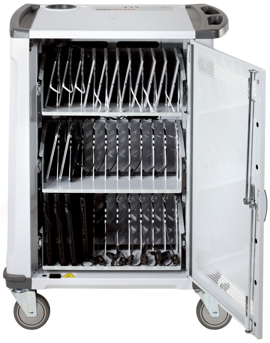 Elegantní design se snoubí s chytrou technologií – pro nabíjená zařízení kdykoli a kdekoli: PARAT Trolley U32 z řady PARAPROJECT® je praktický kufr s mobilní nabíjecí stanicí v jednom. Tři výsuvné zásuvky poskytují prostor až pro 32 Chromebooků/Ultrabooků nebo tabletů v individuálně integrovaných slotech. Sem vkládáte přístroje a jejich kabely vedete do zadní části vozíku, kde jsou elektrické zásuvky. Pouzdro se pak připojí k externí napájecí zásuvce pomocí hlavního kabelu a proces nabíjení lze spustit pomocí vypínače. Pro optimální bezpečnost zařízení je vozík PARAPROJECT® U32 uzamykatelný a má uzamykatelná kolečka. Nahoře je také praktická pracovní plocha, díky které je mobilní nabíjecí a úložná stanice perfektní.