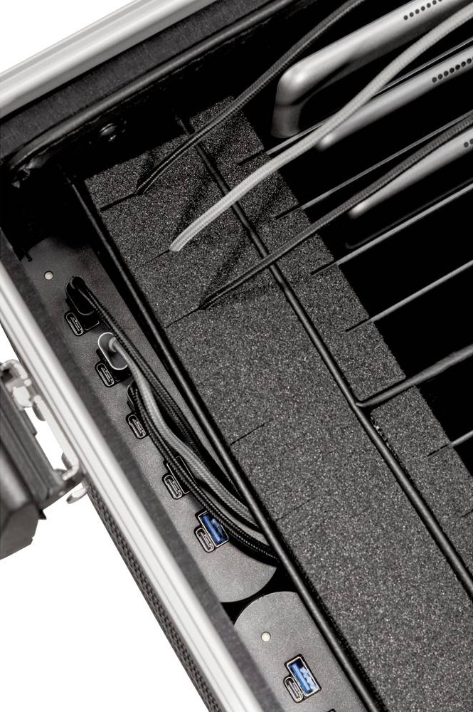 Kompaktní nabíjecí a transportní kufr PARAPROJECT® MicroCase TC15 nabízí prostor až pro 15 tabletů. Díky integrovaným modulům TwinCharge lze připojit všechna zařízení až do velikosti 11", která lze nabíjet přes USB-A a USB-C®. Inteligentní moduly TwinCharge se navíc vyznačují automatickým nastavením přes USB-PD Power Delivery a nabíjením podle standardů QuickCharge. To znamená, že vaše zařízení budou během okamžiku znovu připravena k použití. Hlavní vypínač integrovaný na vnější straně pouzdra a ochranu proti přepětí nabízí PARA1® pro každodenní použití drobnosti jako kabely a propisky díky dvěma kapsám integrovaným do víka pouzdra Toto prémiové pouzdro na tablet je vyrobeno z vysoce kvalitního černého X-ABS a je vybaveno šikovným trolley systémem se čtyřmi kolečky s hladkým chodem, z nichž dvě jsou uzamykatelná Pouzdro je extrémně odolné a lze jej snadno přenášet z místa na místo Kombinované zámky zajišťují dodatečnou ochranu proti neoprávněnému přístupu a integrovanému teplotnímu senzoru spolehlivě a axiálně.