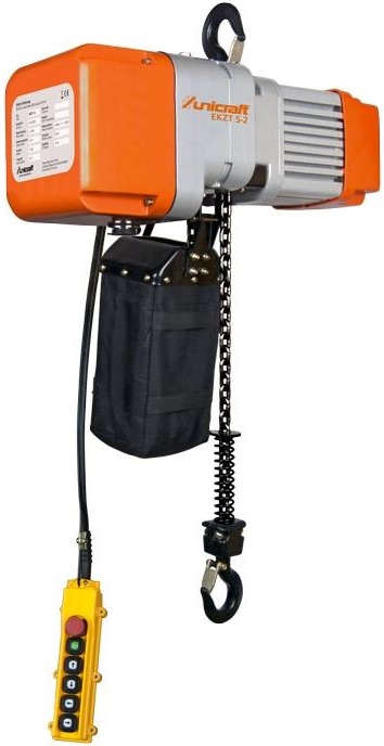 Dvourychlostní elektrický řetězový kladkostroj. Má závěsný hák pro zavěšení kladkostroje. Ochrana proti přetížení pomocí spojky s prokluzem. Vestavěný koncový spínač. Bezpečné uskladněnmí řetězu v pytli.