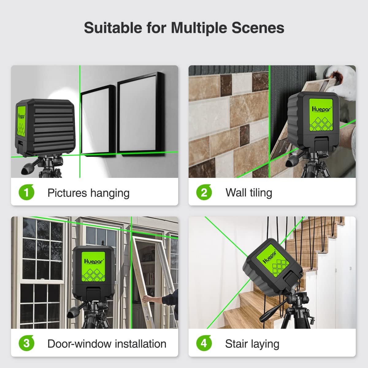 Huepar B011G je kompaktní samonivelační křížový laser se zeleným paprskem, určený pro přesné vyrovnávací práce v interiéru i exteriéru.