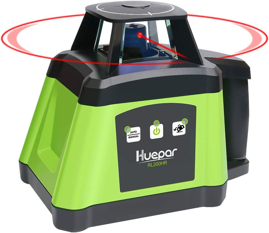 Huepar RL200HR rotační laser červený, samonivelační, vnitřní/venkovní rotační laserová vodováha, pracovní dosah 500 m s přijímačem, včetně laserového detektoru, ochranných brýlí a kufru