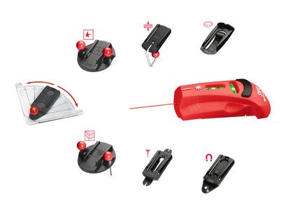 Vlastnosti: Kompaktní lasserový nivelační přístroj určený pro různé povrchy. Jednoduché ovládání jedním tlačítkem. Možno použít na téměř každý povrch s kompletní soupravou šikovných přídavných nástavců. Ideální pomocník při veškerých drobných nivelačních pracích doma. Dvojitá vodováha s podsvícením. Laserová přímka je promítána pod jakýmkoliv úhlem.