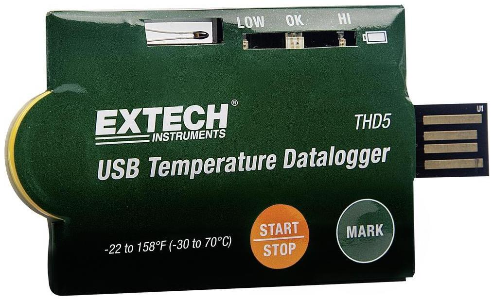 Datalogger pro záznam teplot s USB je přenosný a je určen pro jednorázové použití (uložení až 8192 záznamů). Datalogger pro záznam teplot s USB 2.0 má pouzdro velikosti kreditní karty. Termistor NTC zajišťuje záznam dat přesnějších měření teplot. Uživatel může programovat tyto předvolby: jazyk, rychlost snímání, start se zpožděním, alarm se zpožděním, vysoký nebo nízký rozsah pro hlášení mezních hodnot alarmem. Další vlastnosti jsou zobrazení stavu červenou a zelenou LED diodou, stisknutím tlačítka start začne kontinuální záznam dat, dokud není zaplněna paměť. (max. 8192 záznamů, nebo se zastaví po stisknutí tlačítka Stop). Pokud je datalogger připojen k PC, generuje se po stlačení tlačítka zpráva ve formátu PDF se všemi zaznamenanými daty + vývojový diagram. Datalogger má životnost akumulátoru cca 1 rok.