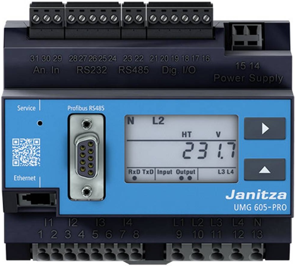 Janitza UMG 605-PRO je výkonný analyzátor elektrické sítě určený pro přesné sledování kvality napětí a spotřeby energie. Díky integrovanému webovému serveru umožňuje přístup k aktuálním i historickým datům bez nutnosti instalace softwaru. Nabízí přehledné ovládání přes vlastní displej nebo vzdáleně pomocí webového prohlížeče a je ideální pro průmyslové a komerční instalace.