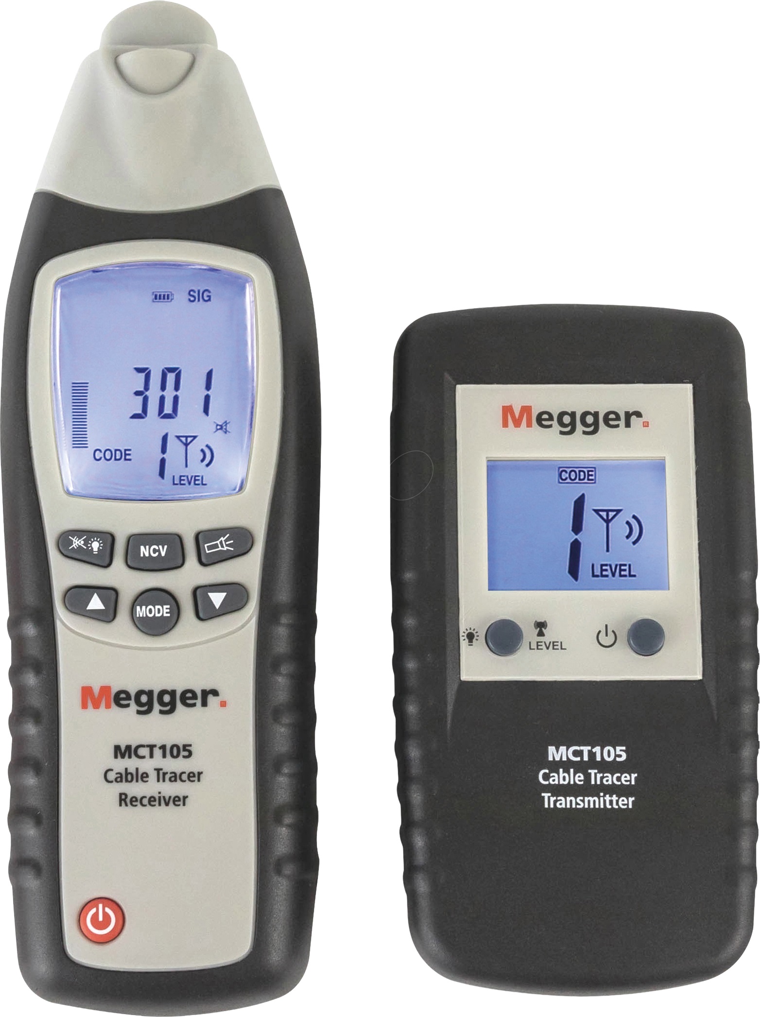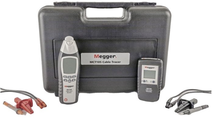 Sada pro vyhledávání kabelů Megger MCT105 obsahuje samostatný vysílač a přijímač. Přístroj je určen k pomoci při detekci a sledování kabelů nebo kovových vodičů ve stěnách nebo zakopaných pod zemí a dokáže lokalizovat a identifikovat pojistky nebo jističe v elektrických obvodech. Dokáže také nalézt přerušení nebo zkraty v kabelech a elektrických systémech podlahového vytápění a lze jej použít ke sledování kovových vodovodních a topných potrubí. Lze jej připojit k vedení bez napětí i pod napětím.