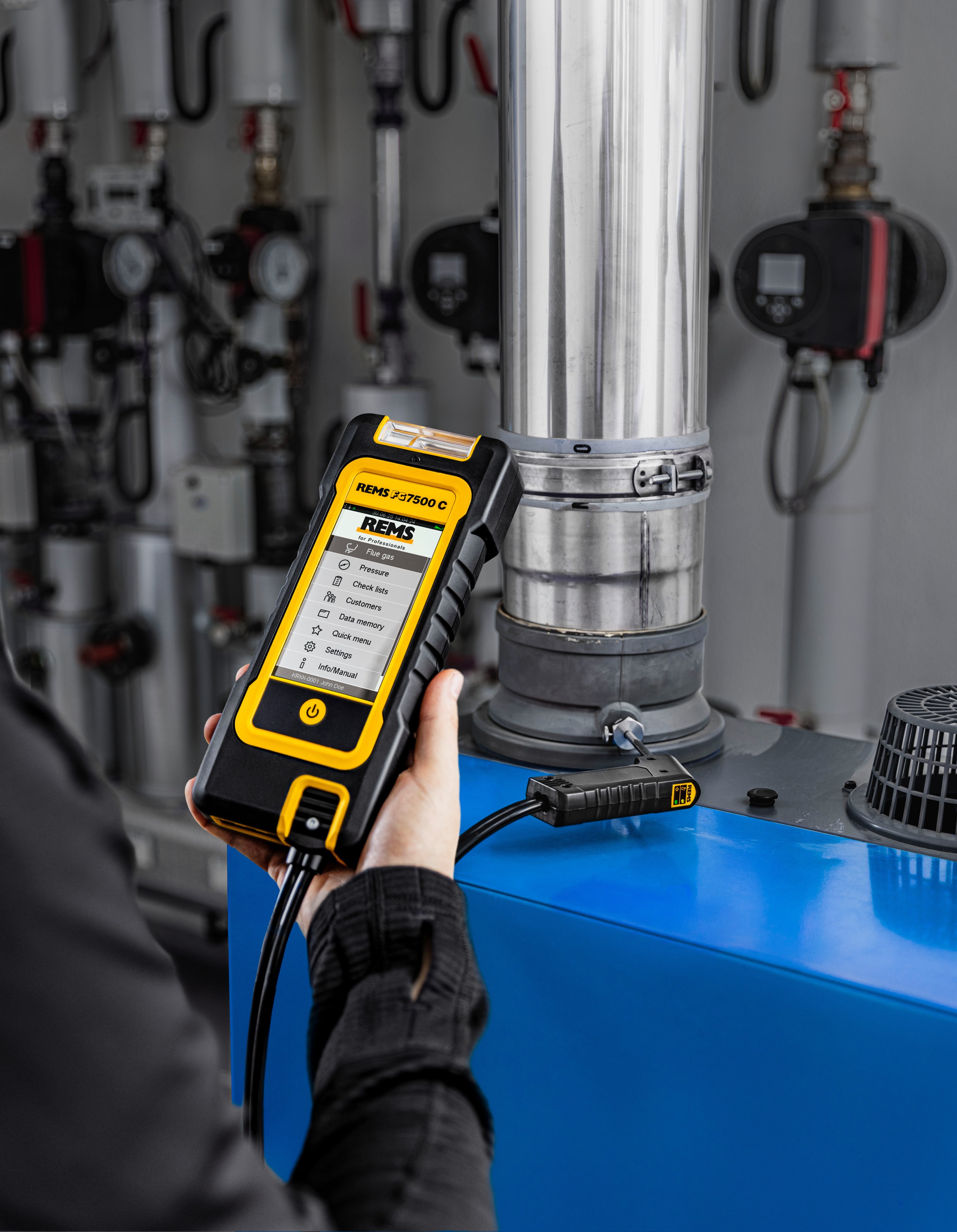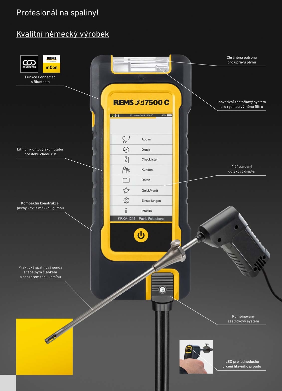 REMS FG7500 NO C je profesionální elektronický analyzátor spalin a tahu určený pro zákonem předepsaná měření spalovacích procesů topných systémů. Oproti verzi FG7500 C je navíc vybaven interním senzorem NO, což umožňuje rozšířenou diagnostiku a plnění přísnějších legislativních požadavků. Přístroj je schválen dle DIN EN 50379 část 1 a 2 a je vhodný pro servisní, revizní i kontrolní činnosti u plynových a olejových topidel.