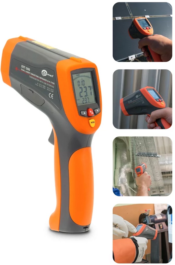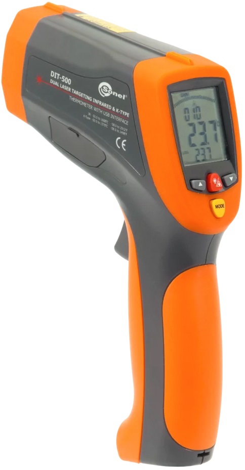 Profesionální infračervený teploměr Sonel DIT-500 umožňuje bezdotykové měření extrémně vysokých teplot až do 1600 °C a současně podporuje měření pomocí termočlánku typu K