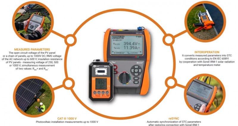 Ve spolupráci se senzorem slunečního záření a teploty Sonel IRM-1 dokáže přepočítávat výsledky na standardní testovací podmínky (STC) dle EN IEC 60891