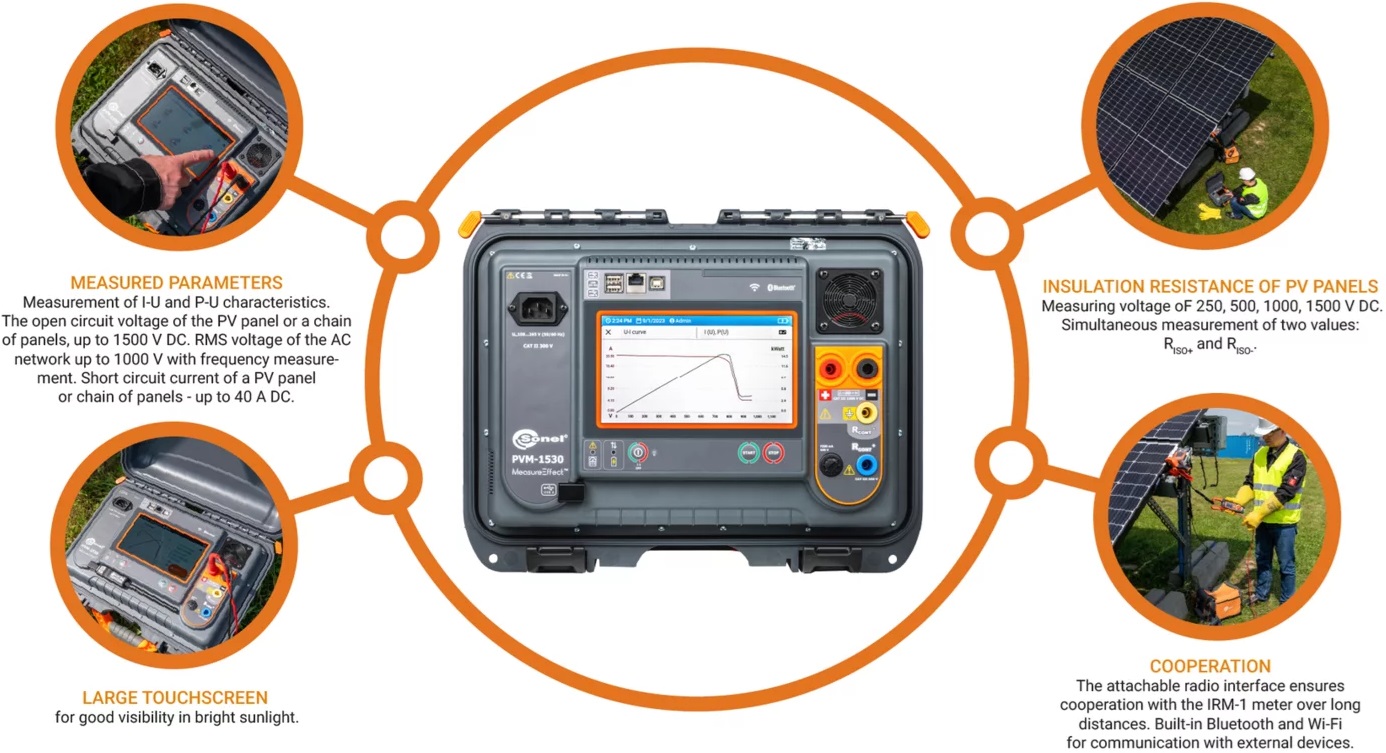 Profesionální tester fotovoltaických instalací Sonel PVM-1530 Max je určen pro komplexní diagnostiku a uvedení FV systémů do provozu až do 1500 V DC.