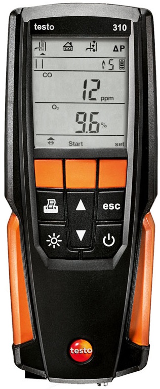 Analyzátor spalin testo 310 je určen pro rychlé a přesné měření spalin. Je osazen dvěma senzory O2 a CO. Samozřejmostí je teplotní čidlo na odběrové sondě. Odběrová sonda je pevně spojena s přístrojem. Dvouřádkový displej s intuitivní navigací v menu se snadno obsluhuje a je dobře čitelný.