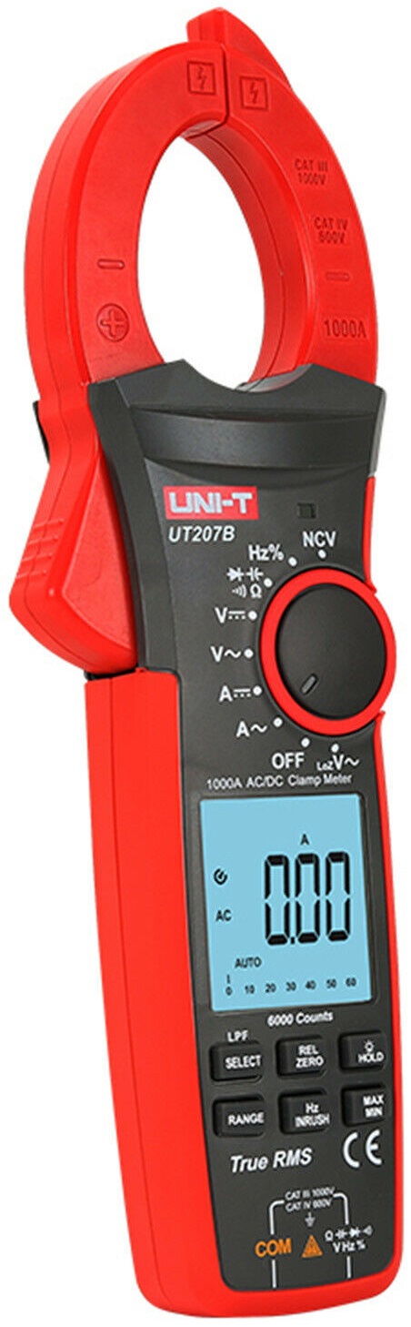 Digitální klešťový měřič UT207B slouží pro měření střídavých a stejnosměrných napětí do 1000V, AC a DC proudů do 1000A a frekvece u nízkého napětí (nn) do 1000V a proudu do 1000A v rozmezí 40Hz až 400Hz a u malého napětí (mn) 10Hz až 1MHz. Na všech rozsazích má ochranu před větším napětím než 1000V a zvukový a optický alarm. Čtyřmístný více segmentový displej o rozměru 43 x 45 mm se zadním podsvícením a rychlou obnovovací frekvencí (3krát/s). Maximální zobrazitelná hodnota je 6000. Displej obsahuje analogovou 31 dílkovou stupnici (bar graf). Rozevření čelistí umožňuje měření na kabelech o průměru až 42mm. Bezkontaktní snímání elektrického pole (NCV) umožňuje detekovat vodiče pod napětím. Přiložená sonda - kryt hrotů na testovacích kabelech umožňuje měření na rozvodech nn v kategorii CAT III bez nebezpečí vzniku oblouku. Bez krytů na hrotech lze měřit testovacími kabely jen na rozvodech nn kategorie CAT II (například zásuvky 230V). Snímačem je citlivá Hallova sonda. Možnost dokoupení pružné smyčky pro měření proudů až do 3000A. Napájecí baterie 3ks 1,5V R03. Příkon měřiče je cca 1,8 mA. Přístroj má funkci automatické úspory energie - po 15ti minutách přechází do režimu spánku, kdy má spotřebu jen <50μA, což účinně prodlužuje životnost baterie. Funkci úspory energie lze vypnout.