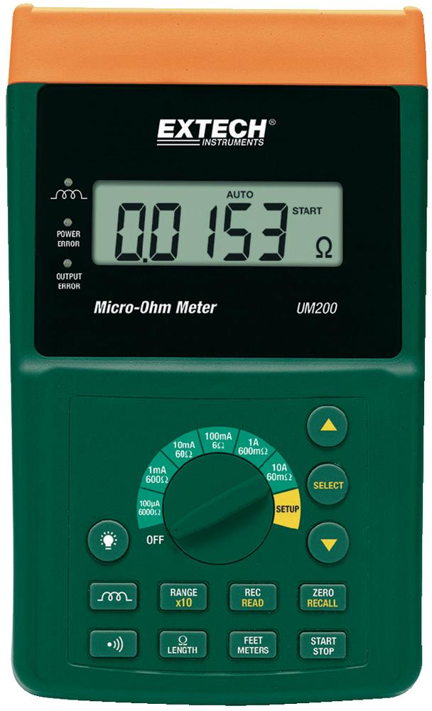 Ohmmetr UM200 umožňuje měření odporu v rozsahu 400 µΩ - 6000 Ω. Vysoké rozlišení umožňuje dokonce měření nízkoohmových součástek a spínacích obvodů. Součástí přístroje je funkce měření délky kabelu. Na základě referenčního měření (1 m) lze určit jakoukoliv délku kabelu. Zařízení může uložit až 20 referenčních hodnot. Měřicí přístroj je určen pro odporové a indukční součástky.