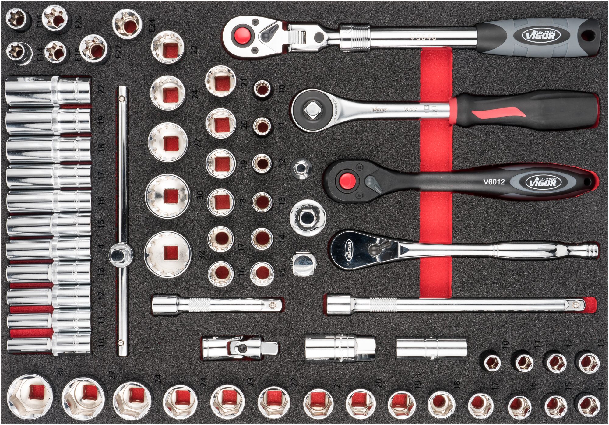 Vigor V6822 gola sada v pěnové výplni, 1/2“, 65 ks