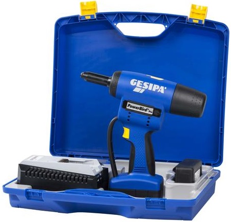 Nýtovací nářadí PowerBird® Pro, špičky 17/32, 17/36, 17/40, 17/45, 2 rychlovýměnné akumulátoy 18,0 V/2,1 Ah (obj. č. 9319), rychlonabíječka 21,0 V (obj. č. 9322), montážní klíč, plastový kufřík.
