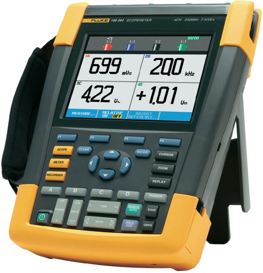 Ruční osciloskop Fluke ScopeMeter® řady 190 II spojuje nejpřísnější bezpečnostní specifikace, odolnost a přenosnost s vysokým výkonem stolního osciloskopu. Tento odolný kapesní přístroj je určen pro inženýry a techniky v servisu, údržbě a instalaci a může být použit v náročných, špinavých a nebezpečných podmínkách v průmyslových zařízeních k provádění komplexního testování od mikroelektroniky po elektroniku energetických systémů.