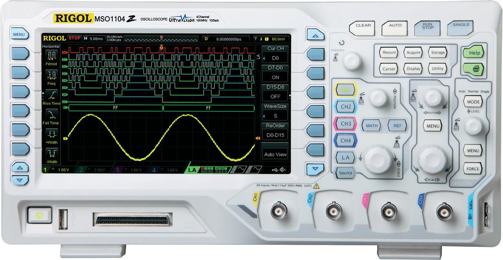 Model MSO1104Z-S je 100MHz osciloskop pro smíšené signály se 4 kanály, 16 digitálními vstupy a s vynikajícími vlastnostmi, jako například velká hloubka paměti 12 Mpts. Integrovaný trigger sériových sběrnic a 7" barevný displej pro optimální zobrazení měřených signálů. Standardem je ovládání přes LAN, USB a RS232, stejně jako mnoho matematických funkcí. Verze S obsahuje 2kanálový, 25MHz arbitrární funkční generátor