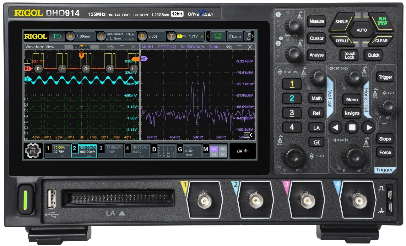 Digitální osciloskop Rigol DHO914 je moderní 4kanálový přístroj s 12bitovým rozlišením určený pro přesná měření v elektronice, vývoji a laboratorních aplikacích. Díky vysoké rychlosti vzorkování, velké paměti a pokročilým funkcím analýzy umožňuje detailní sledování a vyhodnocení složitých signálů.