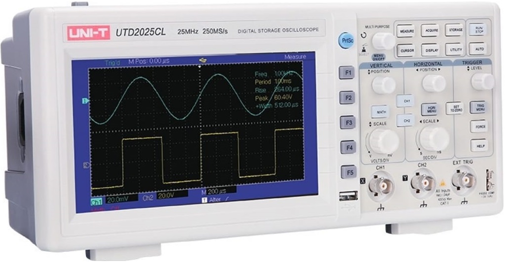 Stolní digitální osciloskop s možností ukládání informací ze série UTD2000L nabízí 2 kanály a vzorkování 250 MS/s, které je bohatě dostačující pro šířku pásma 25 MHz. Díky funkci USB OTG si můžete naměřené hodnoty uložit na USB flash disk. Jednoduchý čelní panel s jasně označenými funkcemi pro základní operace, měřítko a umístění jednotlivých kanálů umožňuje využití návyků při užívání tradičních nástrojů, a proto lze přístroj používat bez nutnosti se cokoliv složitě učit nebo s ním pracovat po dlouhou dobu.