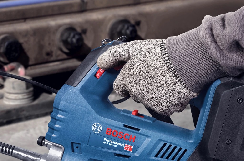 Akumulátorový mazací lis Bosch GFP 18V-10 Professional umožňuje přesné, rychlé a snadné mazání všech typů mechanických částí. Nabízí dva pracovní režimy – pro maximální tlak nebo průtok, a speciální režim čerpadla, který umožňuje nastavit přesný počet stlačení a dávkování. Díky dlouhé hadici a úhlové spojce je ideální i pro mazání těžko přístupných míst.