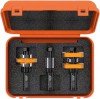 Exkluzivní design. Pouze s frézovací sadou na dvířka CMT lze vyrobit ideální dvířka s rovnou překližkovou výplní. Pro měkké a tvrdé dřevo nebo překližku. Stnadardně čep délky 9,5 mm. Změnou ložiska z o průměru 22 mm na ložisko o průměru 16 mm (obj. kód F079-02500) docílíte prodloužení délky čepu na 12,7 mm. Určeno pouze pro použití ve frézovacím stolku. Není určeno pro ruční frézování.
