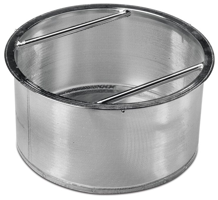 Filtrační koš, nerezová ocel, průměr otvoru 1,5 mm, pro efektivní separaci kapalin a hoblin.