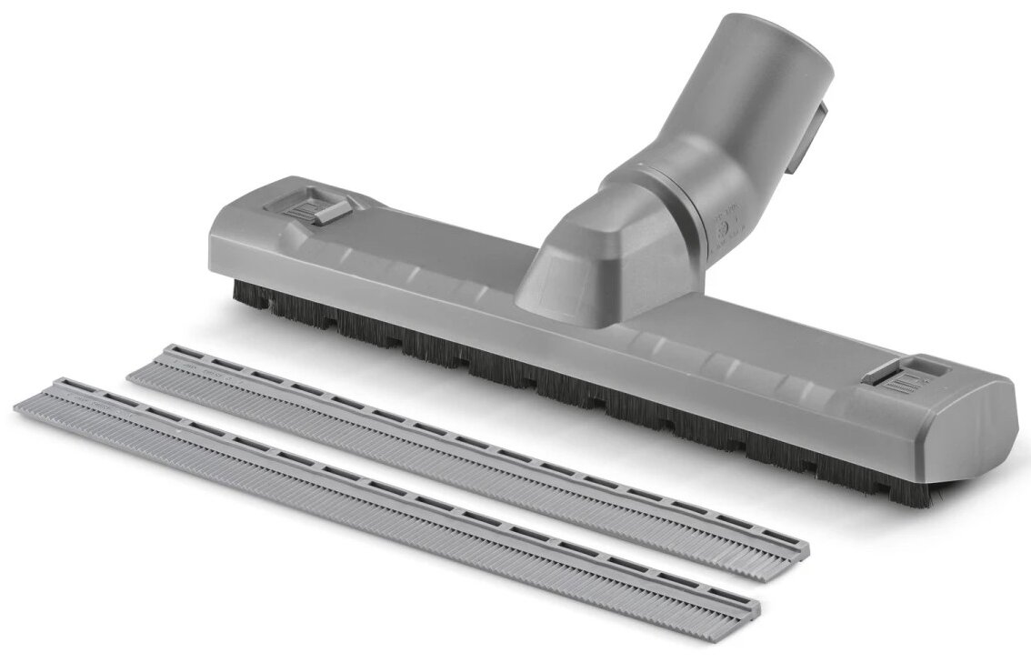 Pro odstraňování jemného prachu, hrubých nečistot a kapalin pomocí mokro-suchých vysavačů Kärcher: podlahová hubice DN 35 z robustního plastu o šířce 300 mm a boční válečky. Má také praktický parkovací hák pro bezpečné uložení u stroje. Kartáčové lišty a stěrky lze snadno a rychle vyměnit pomocí klipu.