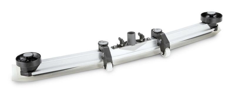 Zahnutá sací lišta s nastavitelnými opěrnými kolečky je dlouhá 1060 mm. Přídavná závaží, které jsou součástí dodávky, zajišťují rovnoměrný přítlak. Rýhované sací stěrky z kvalitního a průhledného polyuretanu odolného vůči olejům s dlouhou životností jsou vhodné pro všechny běžné podlahy, lze je snadno vyměnit a jsou čtyřnásobně použitelné.