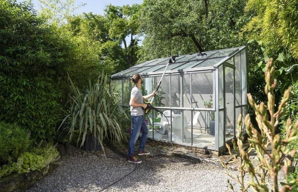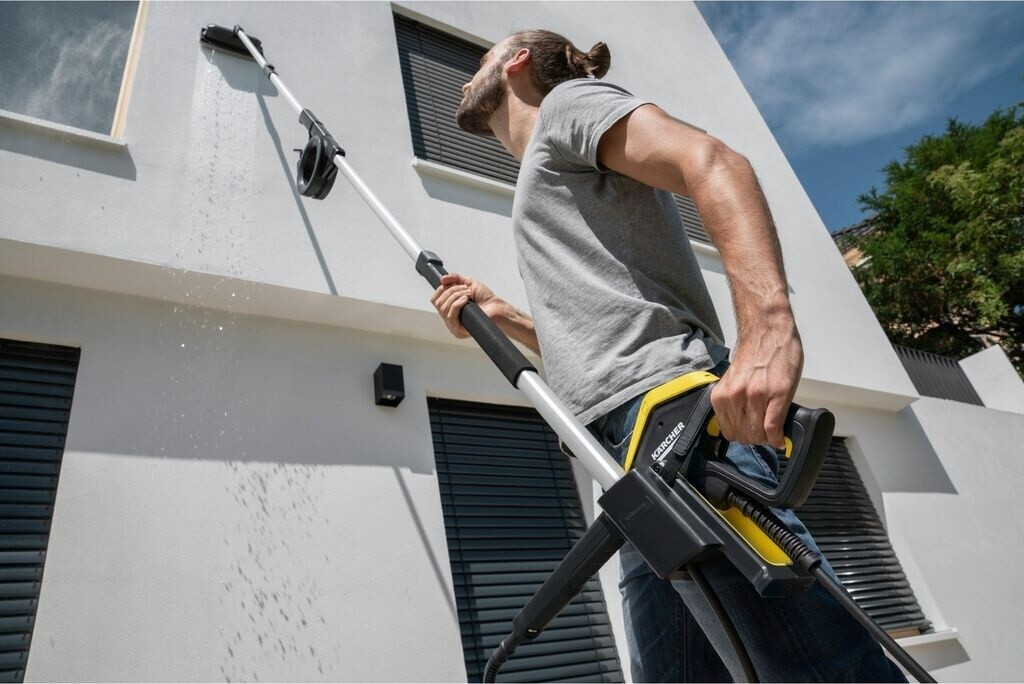 S teleskopickou násadou lze rychle a bez námahy vyčistit i obtížně přístupná místa, například pod fasádami. Nastavitelný kloub o 180 stupňů je další výhodou a umožňuje čištění zimních zahrad, šikmých střech a přístřešků pro auta. Díky používání nástavce na čištění fasád a skel jsou všechna těžko přístupná místa vyčištěna rovnoměrně a efektivně, čtyři vysokotlaké trysky odstraňují odolné nečistoty na různých površích.