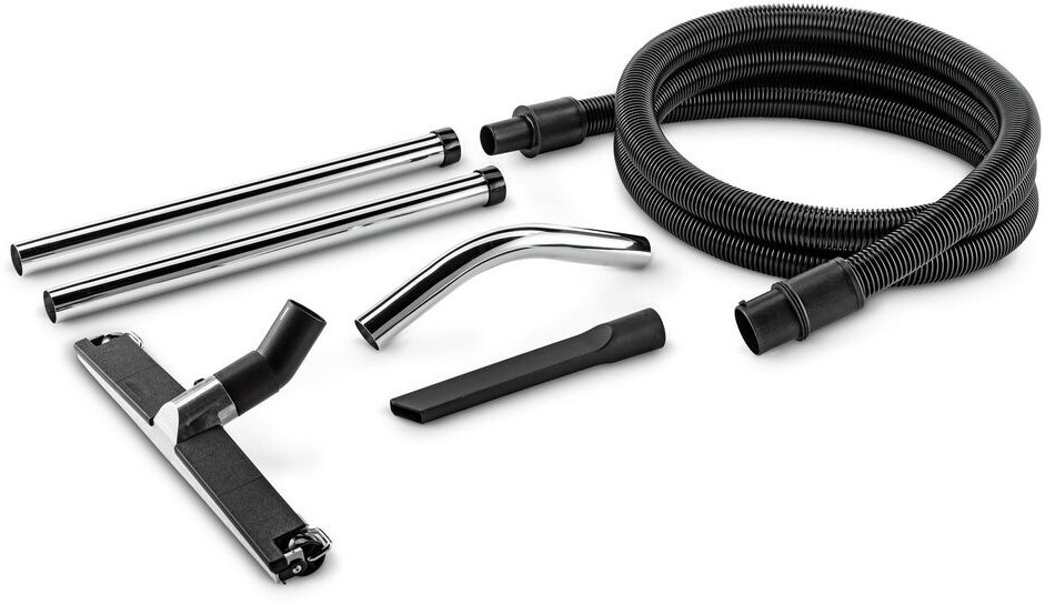 Sada příslušenství pro mokré a suché čištění obsahuje sací hadici, koleno, dvě sací trubky, štěrbinovou hubici a podlahovou hubici