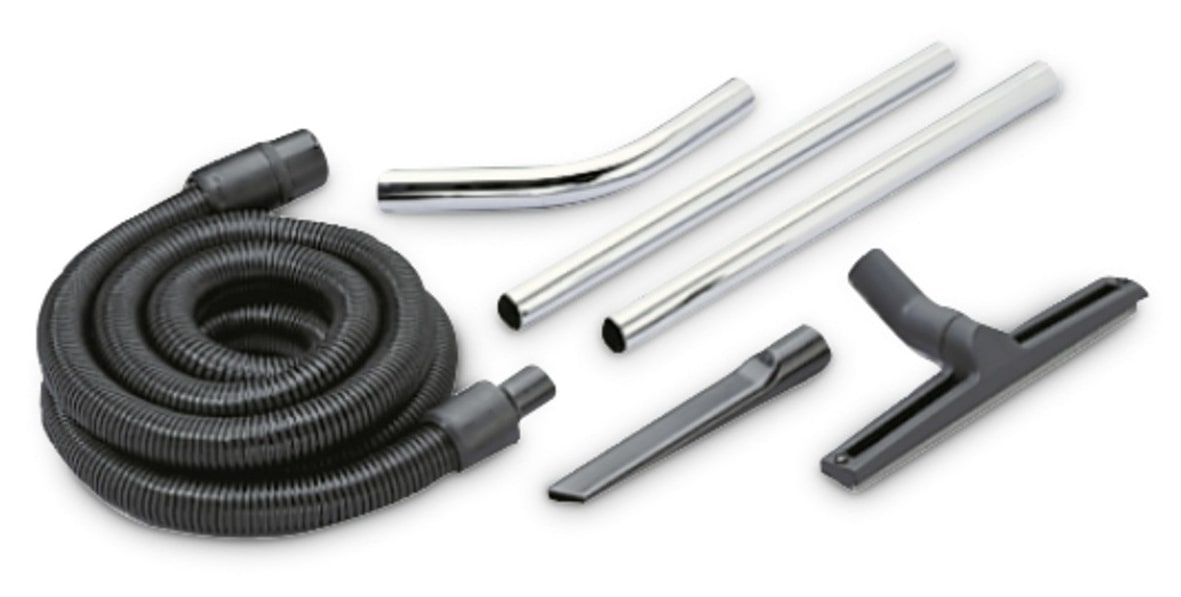 Sada příslušenství pro vysávání mokrých a suchých nečistot v elektricky vodivém provedení: sací hadice DN 40 (4.440-391), ocelové koleno DN 40 (6.900-276), 2 ks sacích trubek DN 40 - 0,55m (6.900-275), podlahová hubice DN 40 (6.905-873), štěrbinová hubice DN 40 (6.903-033).