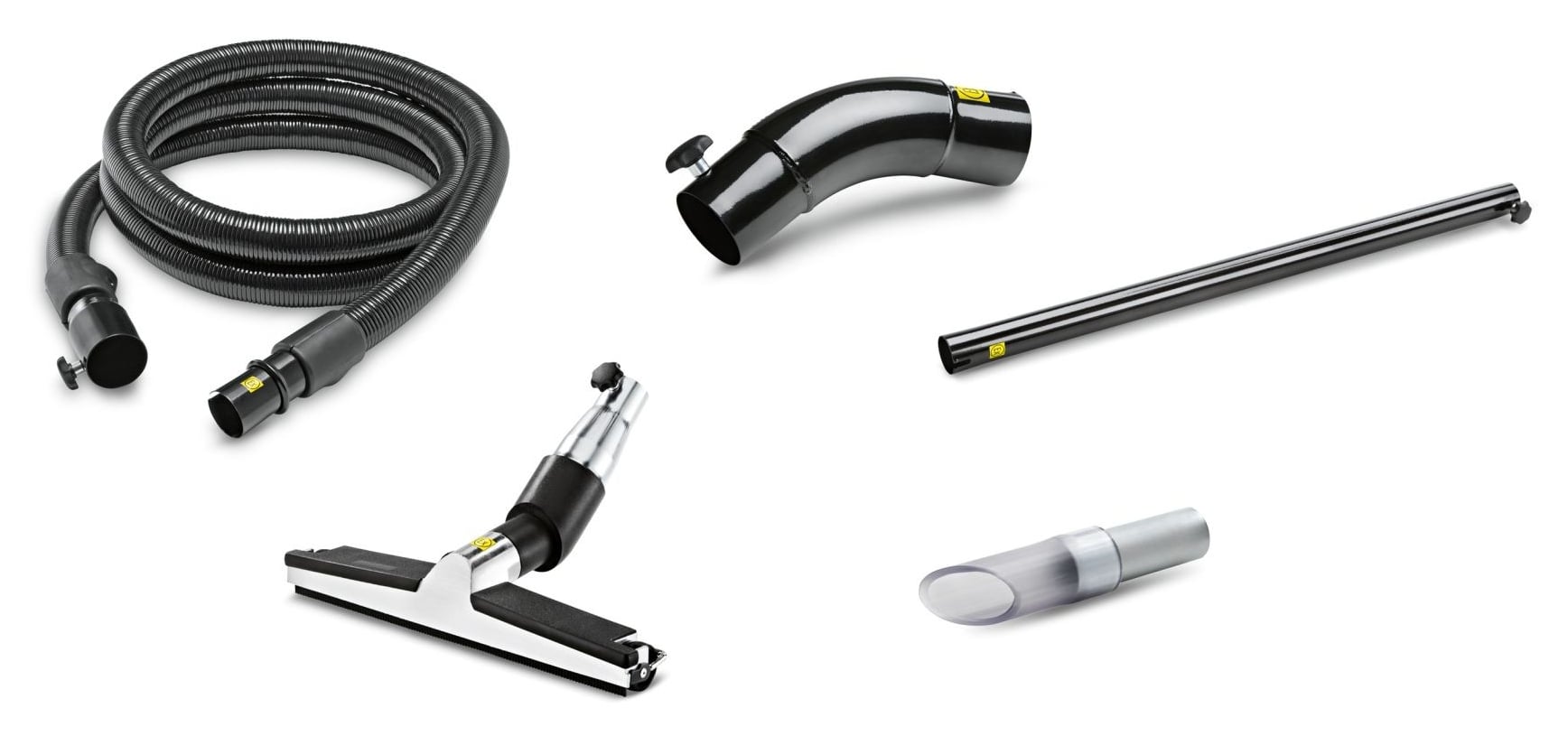 Sada příslušenství, DN 40, pro kapalné nečistoty a třísky: ME-PU hadice, 3 m (9.989-621.0), držák(9.977-679.0), sací trubice (9.977-525.0), podlahová hubice (9.989-683.0), standardní hubice (9.989-674.0).