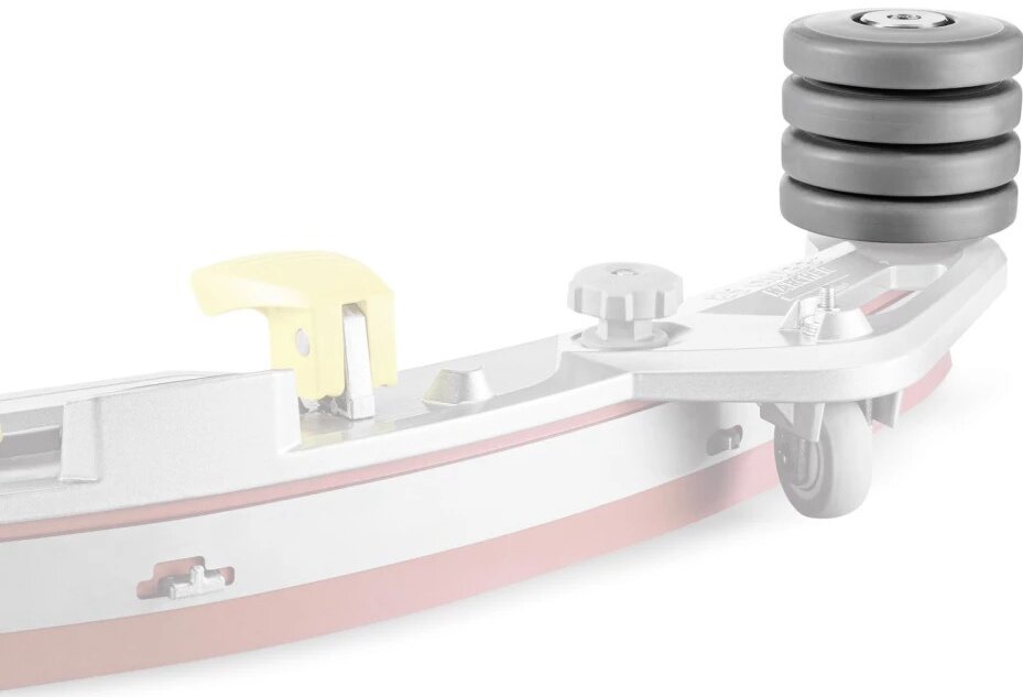 Speciálně vyvinutá sada nástavců s přídavnými deflektorovými válečky pro mycí stroje, které se často používají v obtížných podmínkách, např. když je málo místa na silně přeplněných plochách v supermarketech a při čištění překážek a stěn blízko okrajů, například ve výrobních halách nebo skladech. Podjížděné police, palety nebo vodicí lišty jsou typickými příklady, kdy hrozí zachycení nebo náraz sací lišty. K minimalizaci tohoto rizika Kärcher doporučuje použití těchto přídavných vodicích válečků nezanechávajících stopy. K tomu se jednoduše namontují na standardní vychylovací válečky na koncích sací lišty. Tím se zvyšuje výška sací lišty na jejích koncích přibližně na 16 centimetrů, což pomáhá předcházet poškození stroje a majetku.