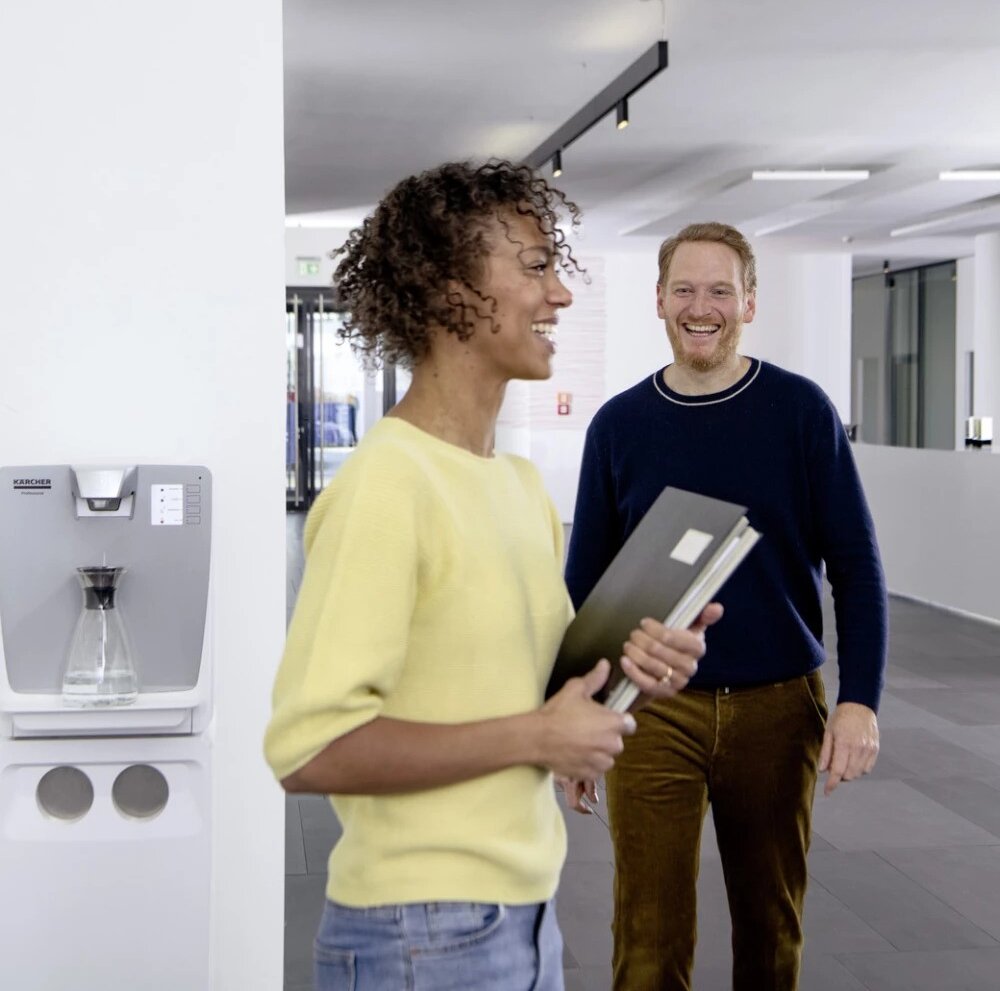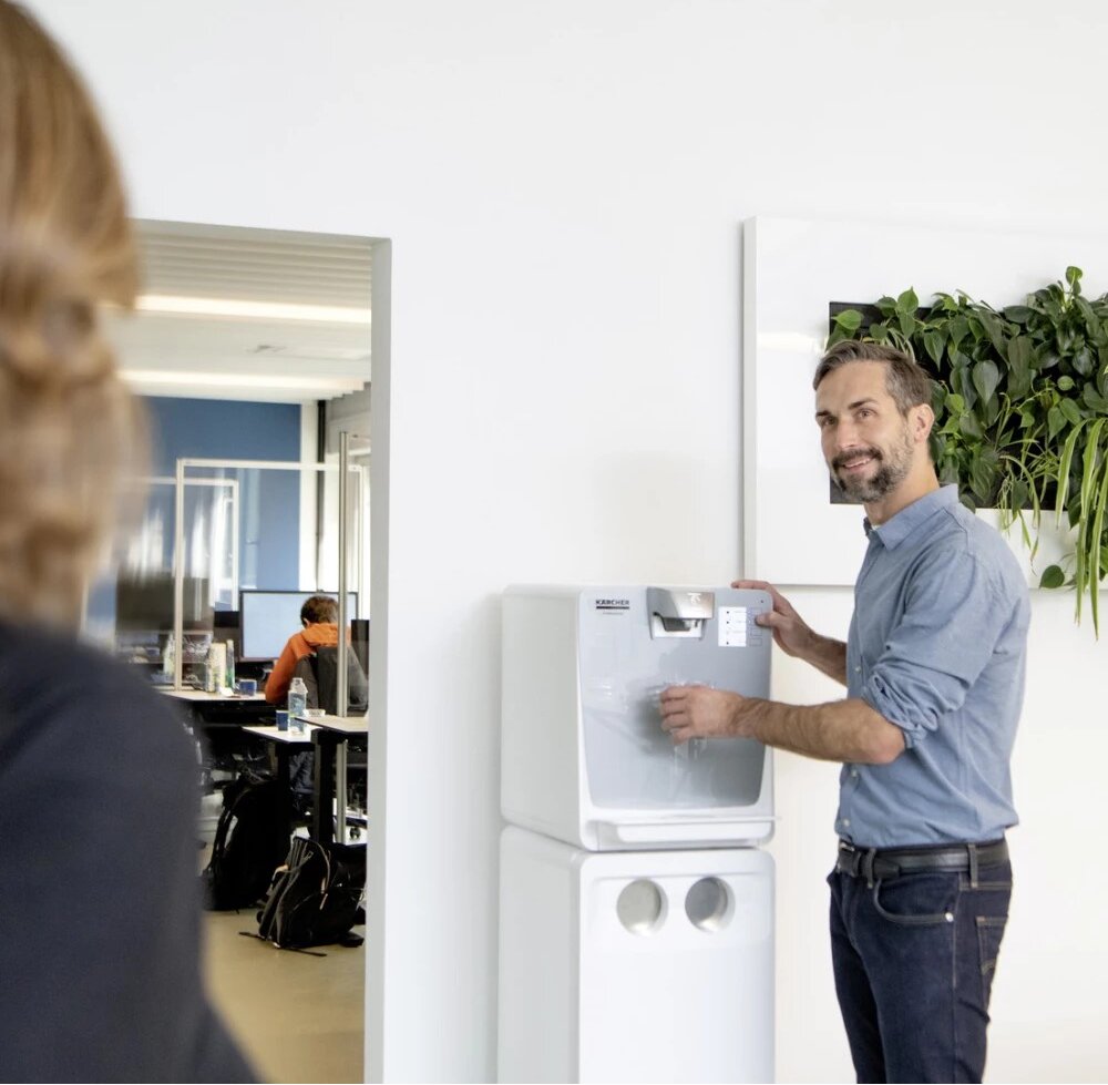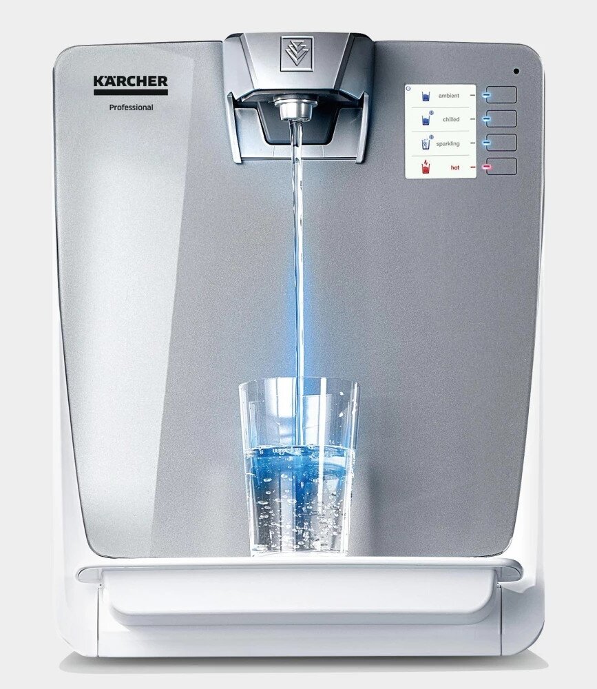 Náš dávkovač vody WPD 200 Adv bílý je vhodný až pro 100 osob a dodává čerstvě vychlazenou, pokojovou, horkou a extra horkou neperlivou vodu stisknutím tlačítka. Pokročilá stolní jednotka je vybavena patentovaným systémem tepelného čištění a přímého odvodu zbytkové vody z odkapávací misky do potrubí odpadní vody, požadavek na přímý servis je tedy velmi nízký. Voda se filtruje buď pomocí filtru Active-Pure nebo Hy-Protect, které jsou k dispozici samostatně od Kärcher. Podlahový stojan a čerpadlo jsou také volitelné. Na přání je také možné vypustit zbytkovou vodu do kanystru. Užitečné funkce pro úsporu energie (režim se sníženou spotřebou energie a pohotovostní režim) jsou standardně integrovány.