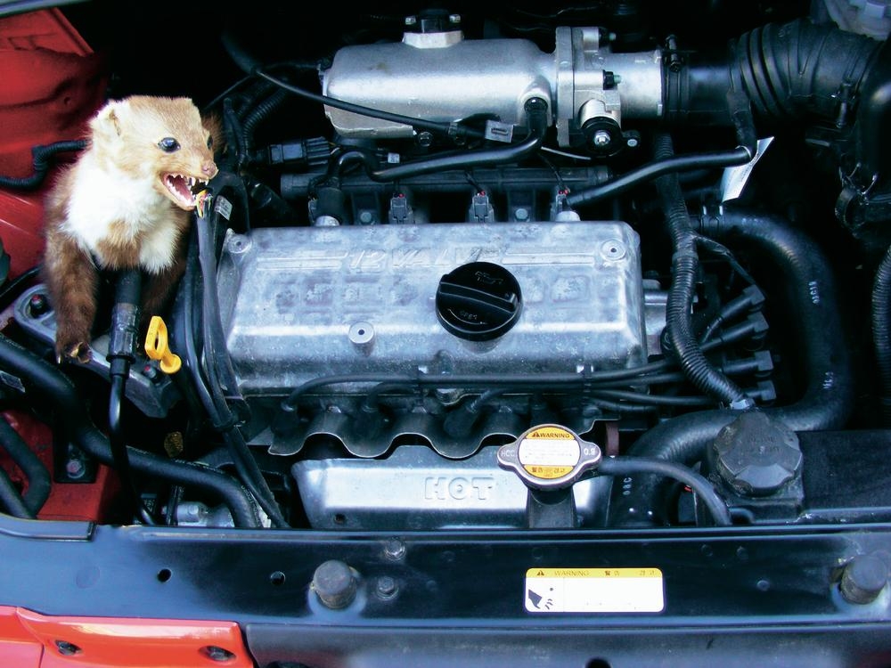 Pokud by se i přes tuto ochranu nějaké zvíře dostalo do auta, zasáhne je díky zabudovaným destičkám s vysokým napětím elektrický proud, který jej vyžene