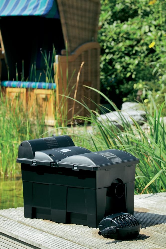 Integrovaný odtok dna k jednoduchému odstranění hrubých nečistot z filtru. Zobrazení teploty vody. Jezírkový filtr lze do 1/3 zakopat. Filtrační set pro okrasné jezírko o objemu 14 m3 vody (bez ryb), s rybami 7 m3 vody a s chovnými rybami a KOI kapry 3,5 m3. Voda z filtru vytéká samospádem.