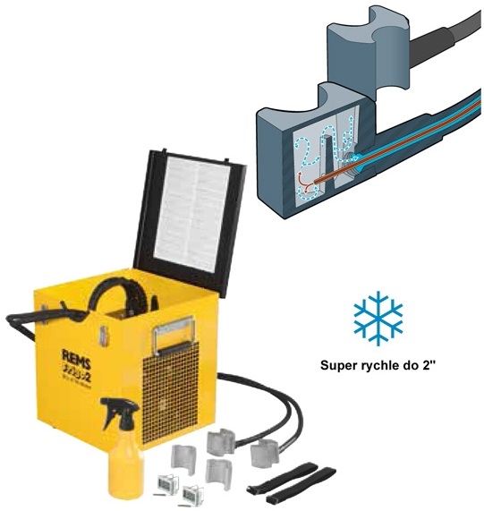 Zmrazovací hlavy - Obzvláště kompaktní zmrazovací hlavy s geometricky speciálně vytvořenými prohlubněmi pro nasazení na různé průměry trubek (Patent EP 1 108 944, Patent US 6,434,952). Výjimečně úzké, jen 50 mm široké. Použitelné kdekoli, i na úzkých místech. Všechny velikosti trubek od Ø ¼–1" příp. Ø 15–35 mm lze zmrazovat s jednou zmrazovací hlavou. Zmrazovací vložky pro zbylý pracovní rozsah do Ø 2", 60 mm. Upínací pásky s uzávěrem na bázi suchého zipu pro jednoduchou a rychlou montáž zmrazovacích hlav na trubku, bez nářadí.