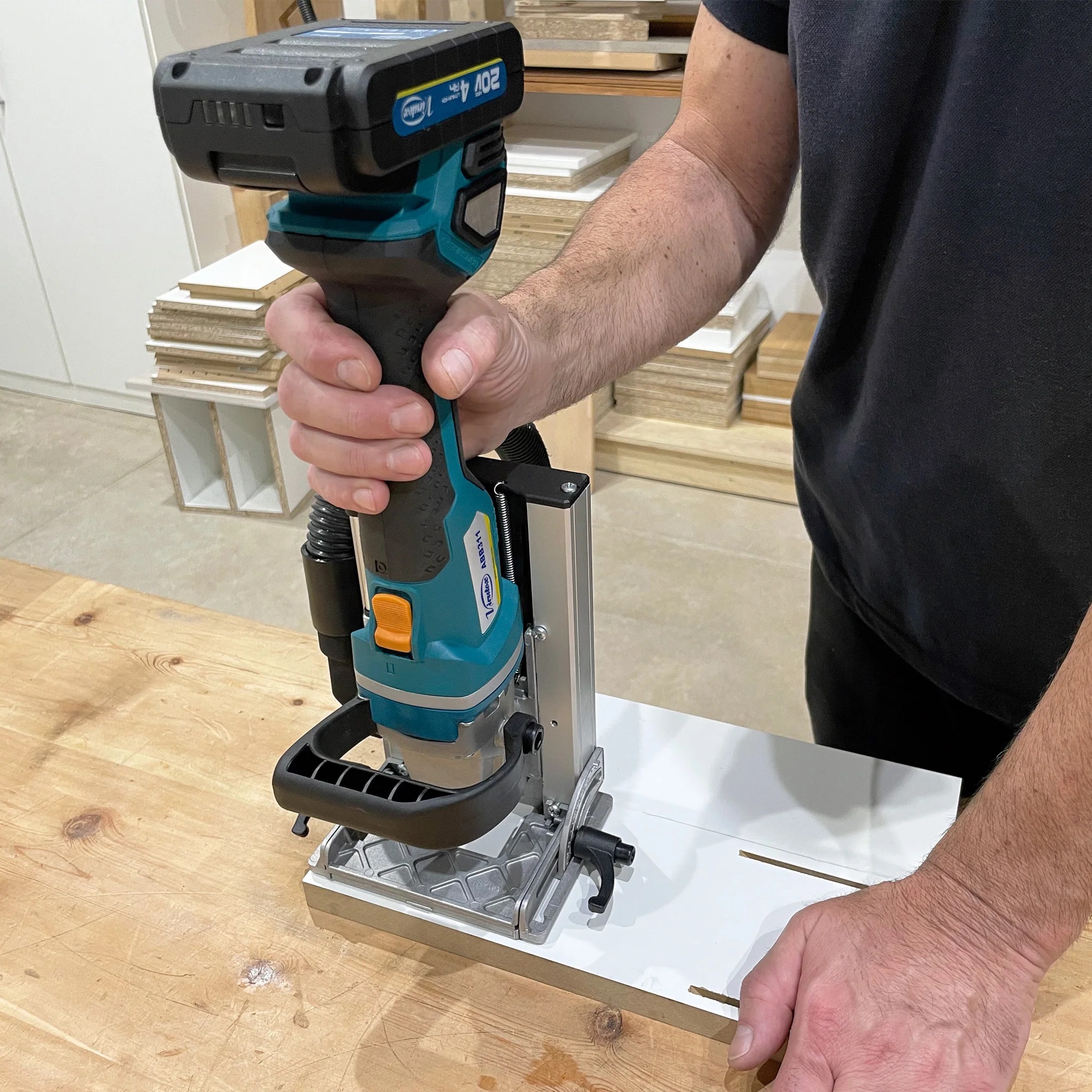 Akumulátorová lamelovací frézka určená pro přesné vytváření drážek pro lamelové kolíky v libovolné poloze