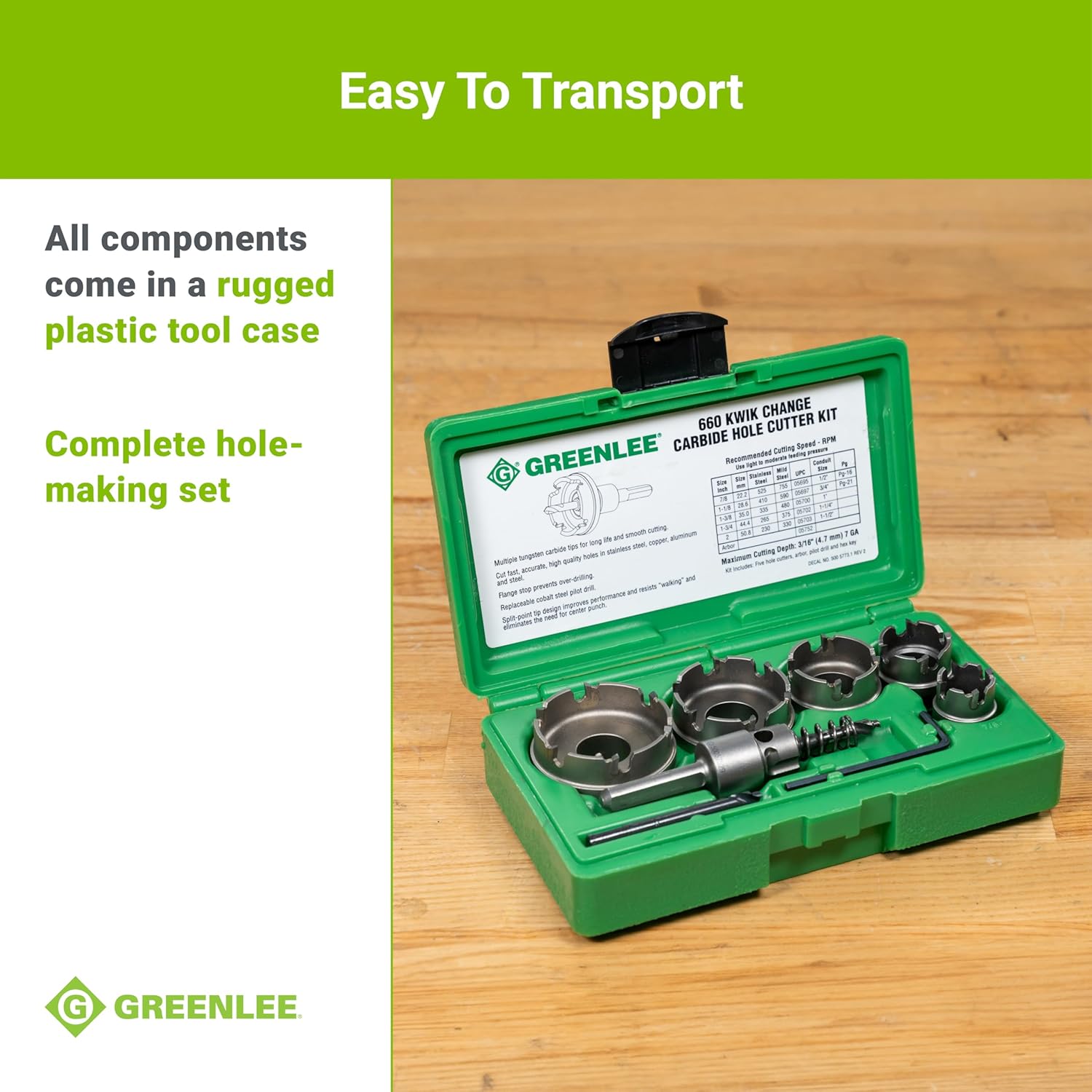 Profesionální sada děrovek Greenlee 660 s tvrdokovovými zuby je určena pro rychlé a přesné vytváření otvorů do nerezové oceli, konstrukční oceli, mědi a hliníku.