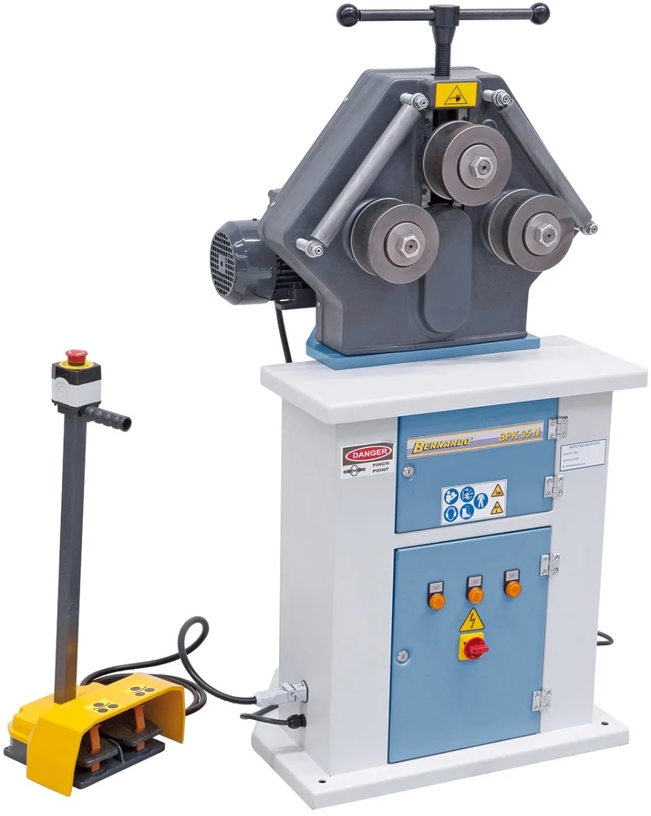 Motorová zakružovačka Bernardo BPK 35 N je univerzální stroj pro zakružování trubek a profilů z různých kovových materiálů. Umožňuje horizontální i vertikální práci a díky nožnímu ovládání zajišťuje pohodlné a bezpečné použití i při náročnějším ohýbání.