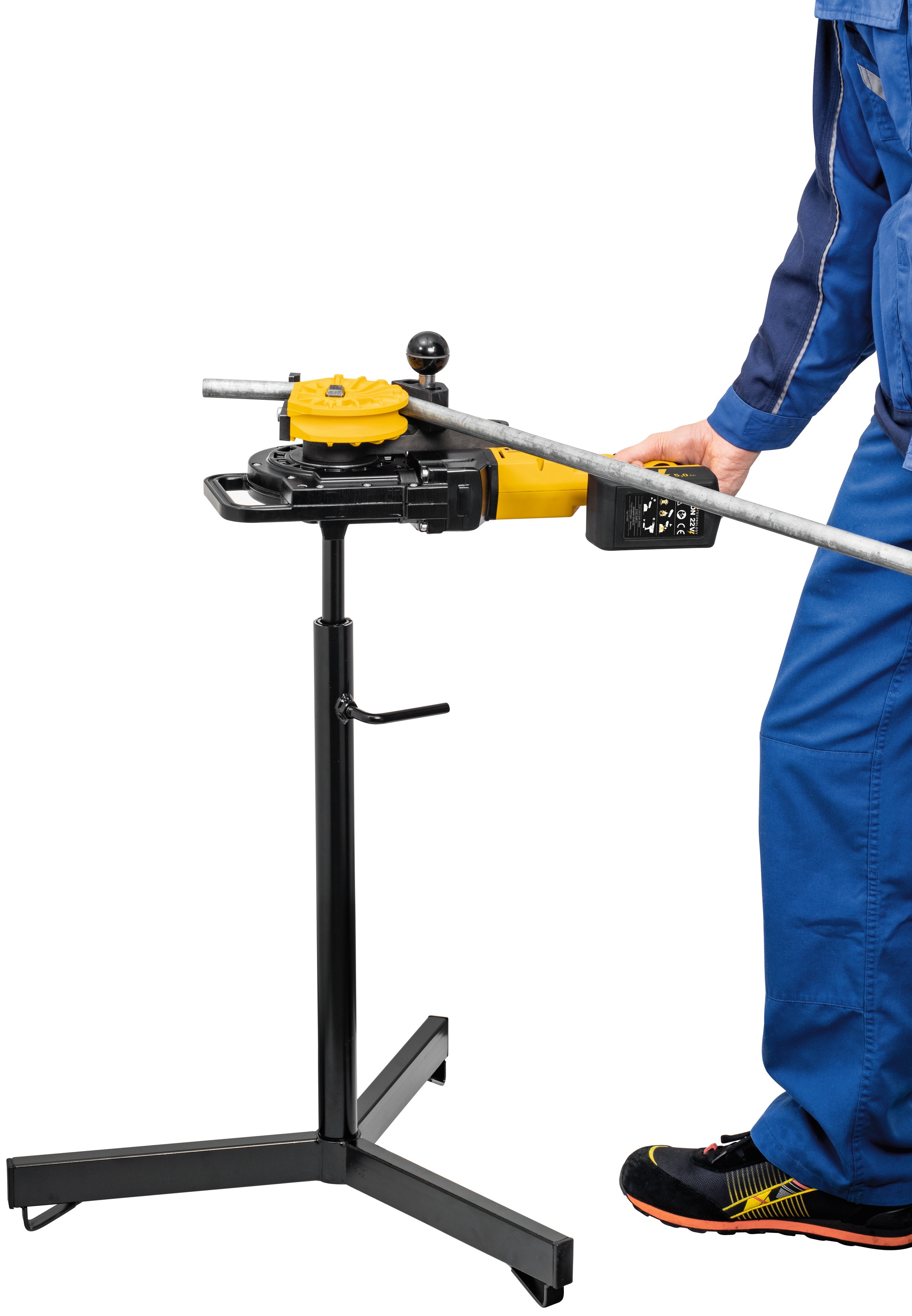 Kompaktní, mobilní, snadno ovladatelný elektrický nástroj s uzavřeným tokem síly při vlastním ohýbání. Super lehká, pohonná jednotka s akumulátorem má hmotnost pouhých 8,5 kg. Praktická uzavřená rukojeť měkkým úchopem (Softgrip). Všude okamžitě použitelná. Žádné nastavovací práce. Jednoduchá, rychlá práce bez námahy. 90° ohyb Ø 22 mm za pouhých 6 s. Rychlý a pomalý pohyb s okamžitým zastavením pro přesné ohýbání. Vyhnutí, dvojité ohyby, etážové ohyby, zpětné ohyby možné. Výškově nastavitelný držák přístroje jako příslušenství.