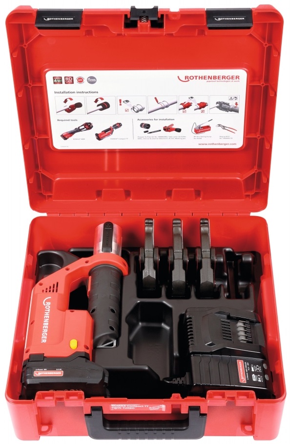Aku lisovací zařízení ROTHENBERGER ROMAX COMPACT TT M 15-22-28 je světová novinka pro servisní práce, lisuje železné fitinky do 35 mm během 3 sekund díky novému turbu.