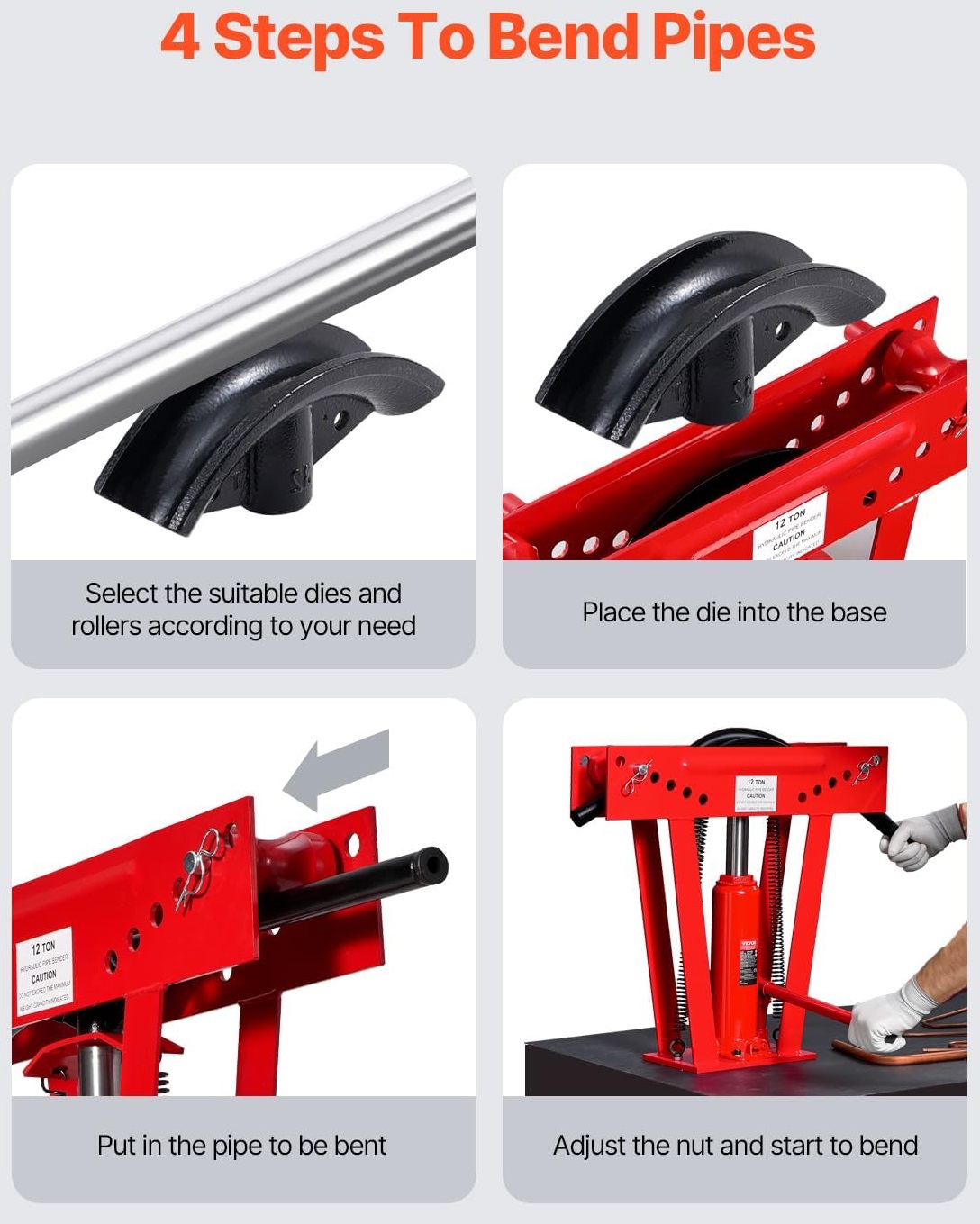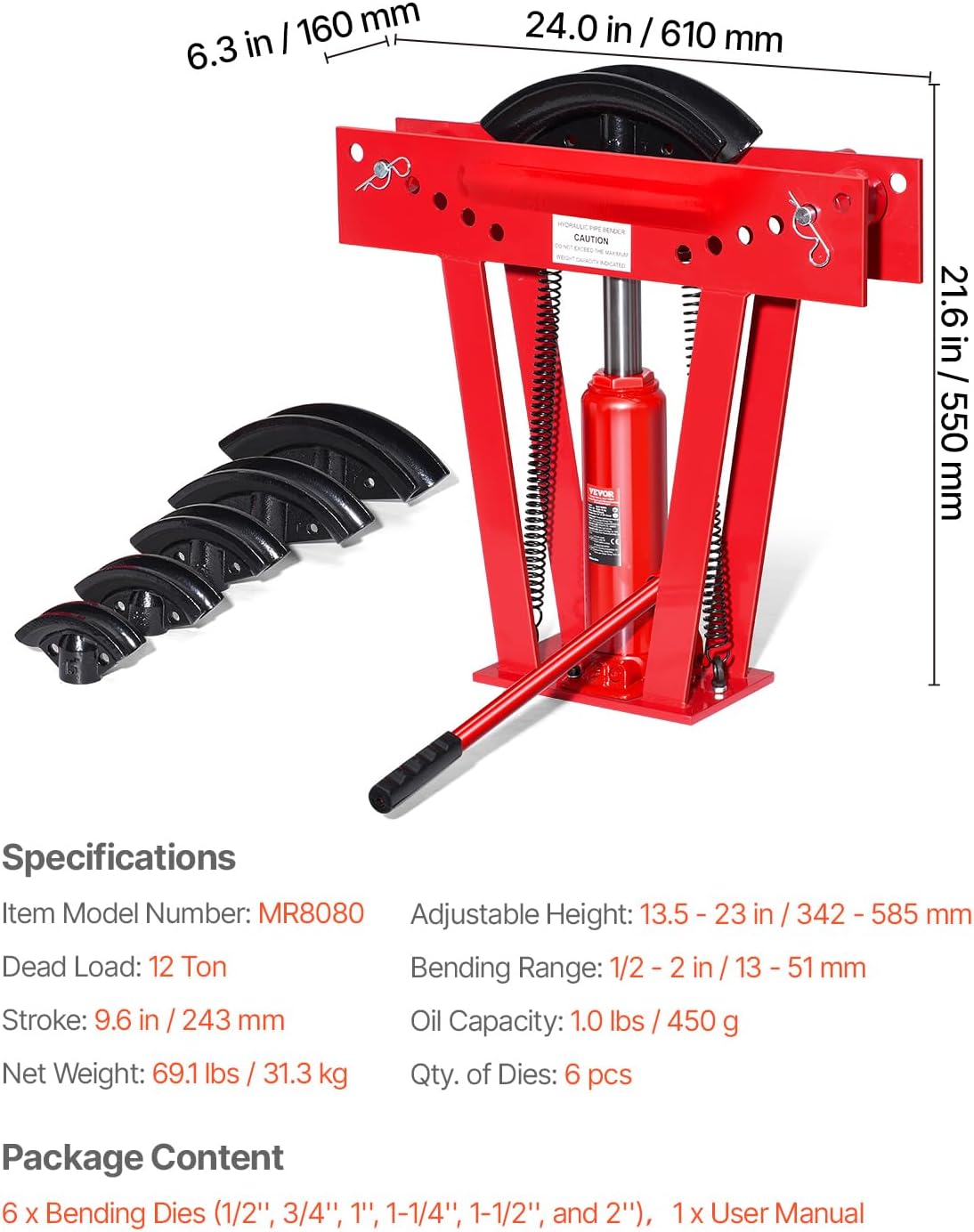 VEVOR hydraulická ohýbačka trubek 12 t, 1/2–2" + 6 matric