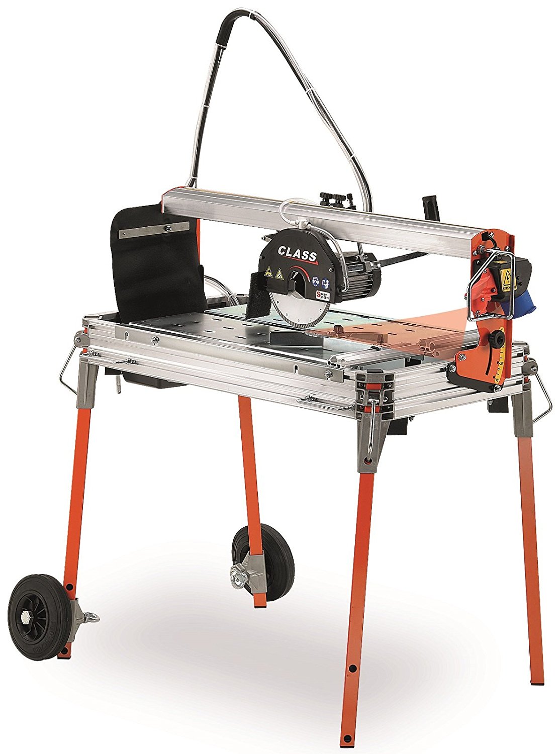 Je profesionální mobilní diamantová kotoučová pila mostové konstrukce, která je vhodná pro rychlý a přesný řez obkladů, dlažby, keramiky, žáruvzdorných materiálů, přírodního kamene, žuly, mramoru a stavebních deskových i blokových materiálů s prořezem do 40mm a maximální délku řezu 670mm. Hloubku řezu je možné regulovat pomocí aretace na řezací hlavě portálu pily.* Pila je vyrobena z lehkého hliníku a je vybavena skrápěcím systémem s vodním čerpadlem S0, systémem čtyř demontovatelných nohou (pozinkovány), úhelníkem. Model CLASS 670S je navíc vybaven laserovým pravítkem. Systém posuvu řezného kotouče je řešen s pomocí otočného kolečka a soustavy kladek a 8 rolen. Celý tento systém je uložen v portálu pily.