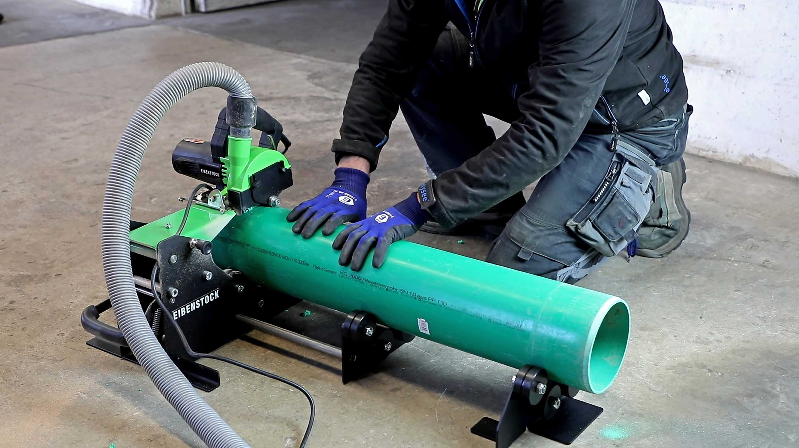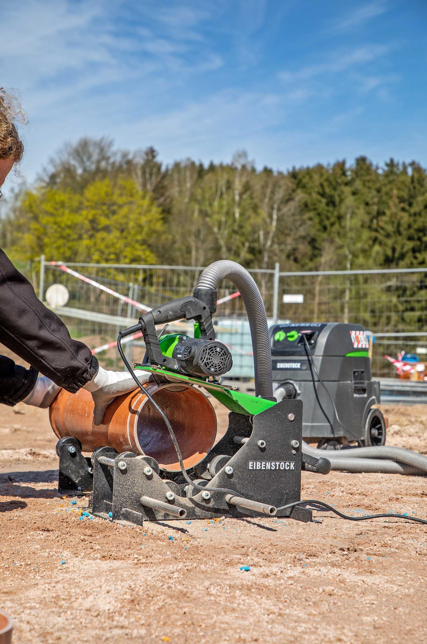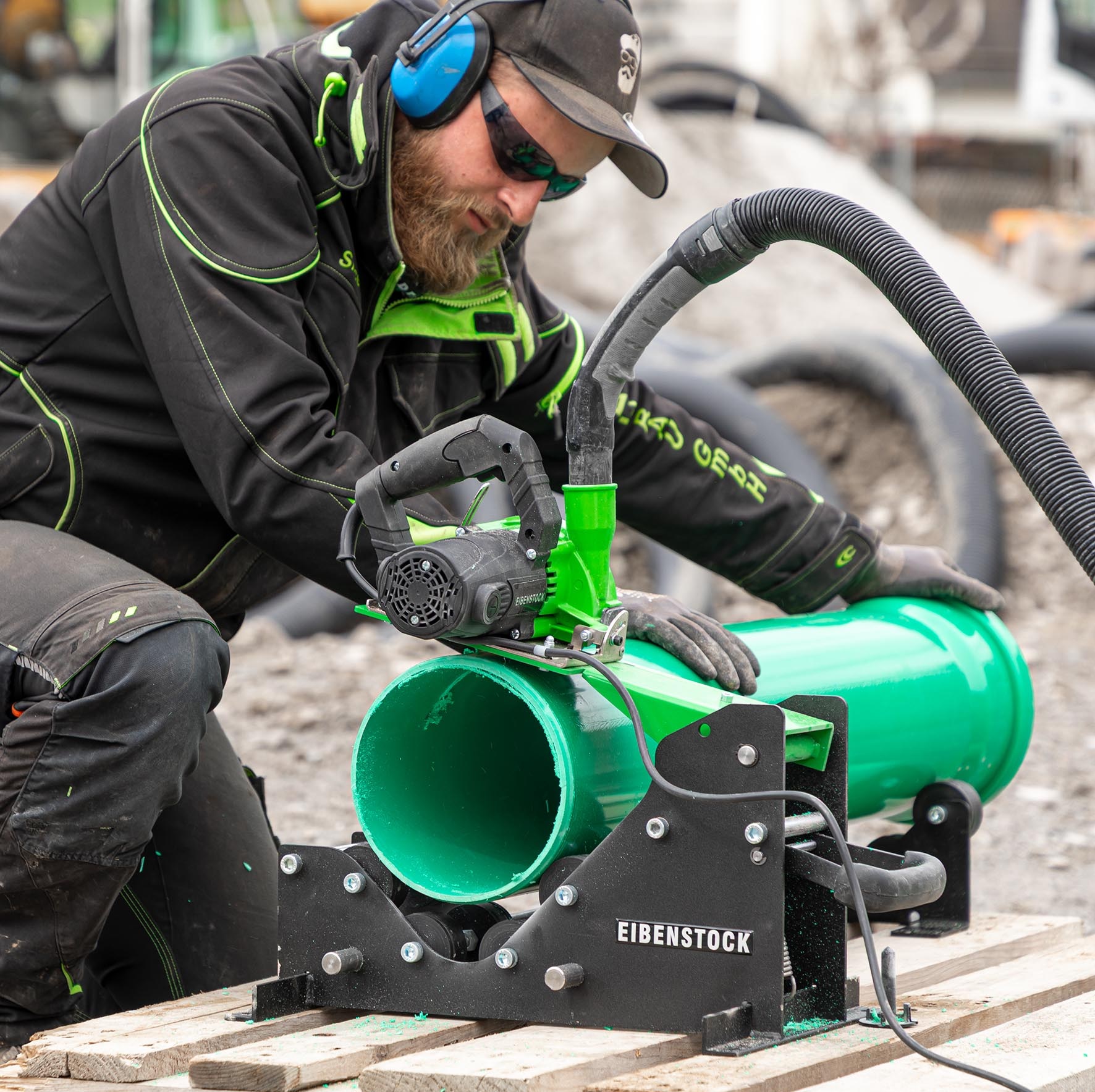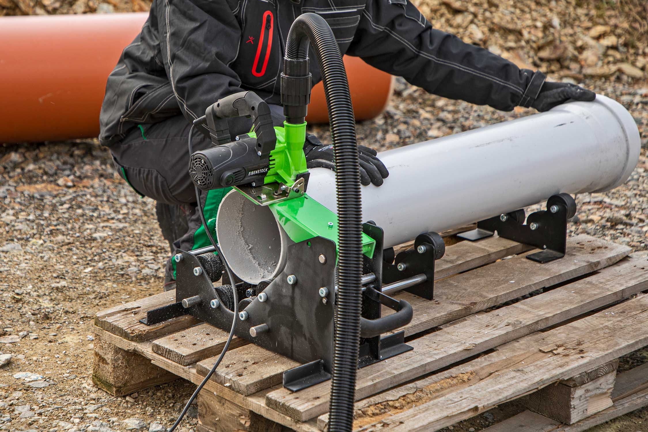 Profesionální elektrická pila Eibenstock ERC 350 umožňuje přesné řezání a současné srážení hran plastových trubek v jedné operaci